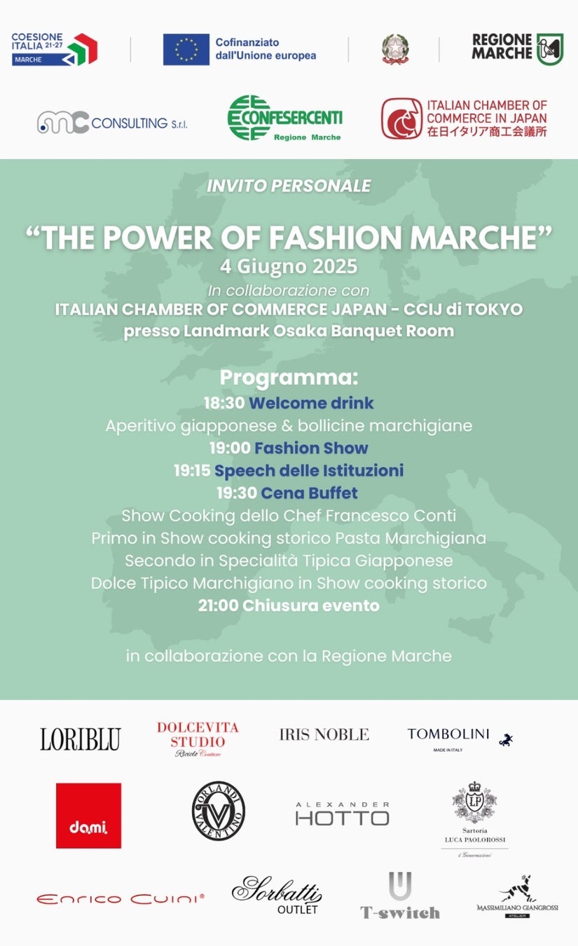FASHION MARCHE (マルケ州 ファッションの力)が開催された。「Ars ~ マルケ州の技術と能力」(Ars: the Marcheʼs genius and skills)をテーマに基づき、マルケ州の最新モードを大阪で、