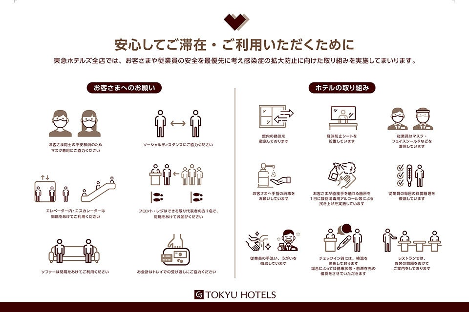 神戸三宮東急REIホテルでは、お客さまや従業員の安全を最優先に考え、感染症の拡大防止に向けた取り組みを実地してまいります。