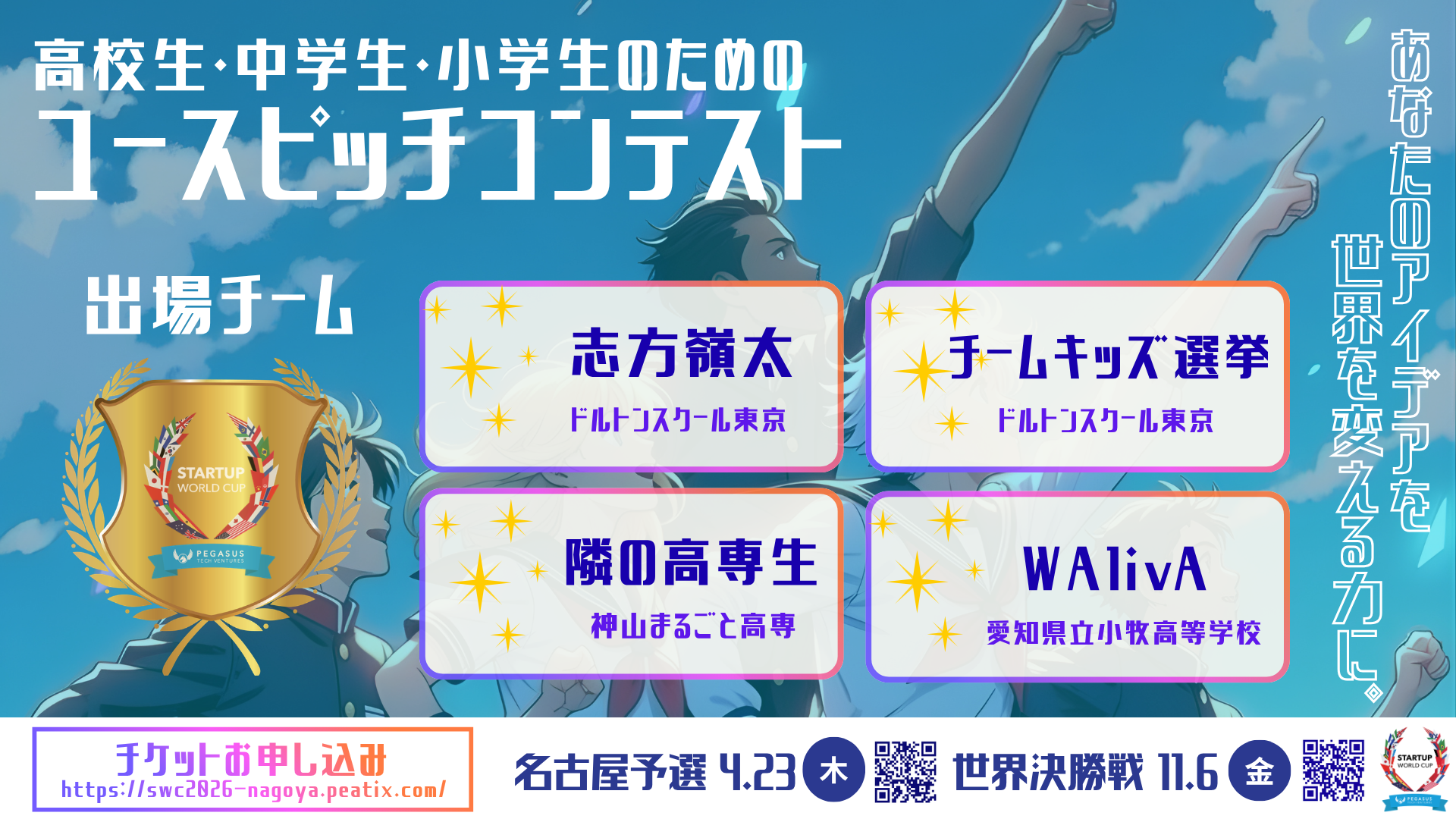 【スタートアップワールドカップ2026名古屋予選】 世界へ挑む「ユースピッチ」出場チームがついに決定!