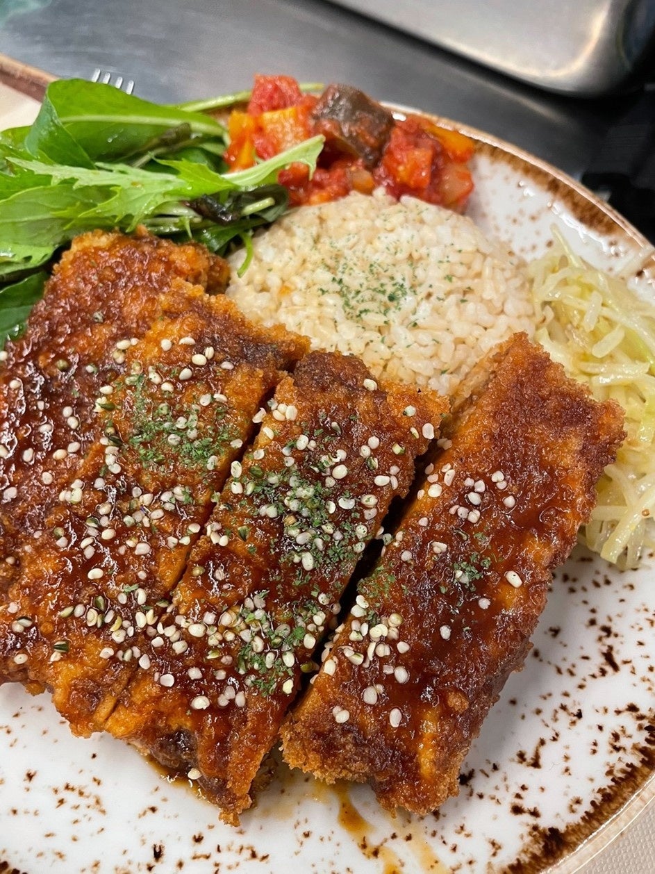 テンペスト(発酵大豆)を揚げたカツレツ風の「テンペカツ」をメインとしたパワフルなお弁当。オーガニック素材で作った自家製カツソースが、テンペカツの旨みをさらに引き立たせます。衣には、香ばしい風味とサクサクした食感がおいしい「玄米ぱんこ」を使用しました。お腹も大満足なボリューミーなカツは、プラントベースで作っているので食後も軽やかにお過ごしいただけます。