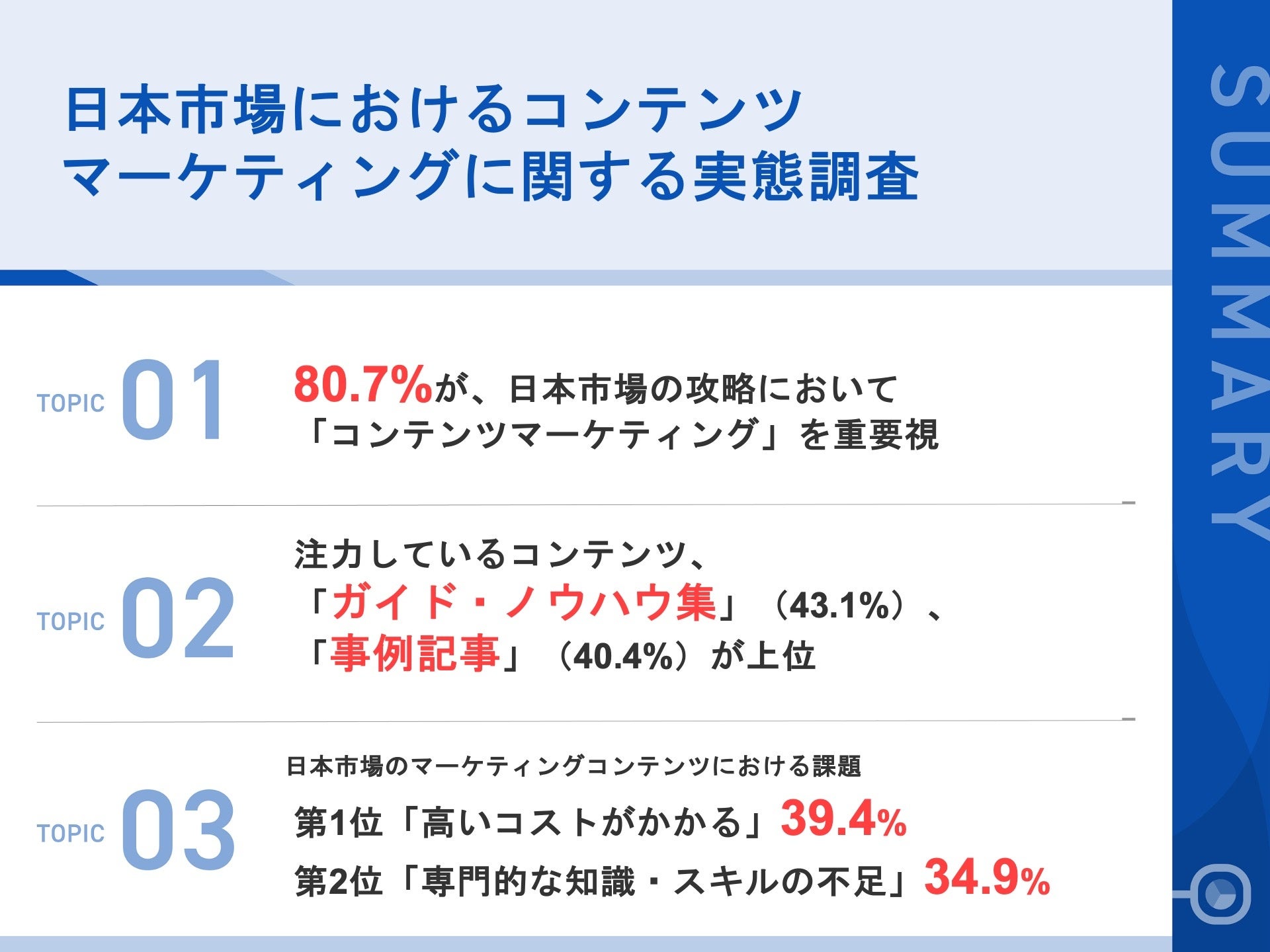 まず、コンテンツマーケティングを実施している理由については、4割以上が「顧客ロイヤリティの向上」と回答しており、80.7%が、日本市場の攻略において「コンテンツマーケティング」を重要視していることが分かりました。また、注力しているコンテンツとしては、「ガイド・ノウハウ集」(43.1%)、「事例記事」(40.4%)が上位に挙がっています。さらに、日本市場のマーケティングコンテンツにおける課題を聞いたところ、第1位「高いコストがかかる」(39.4%)、第2位「専門的な知識・スキルの不足」(34.9%)という結果になり、74.4%が、「今後コンテンツマーケティングの活動や予算を増やしたい」と回答しました。