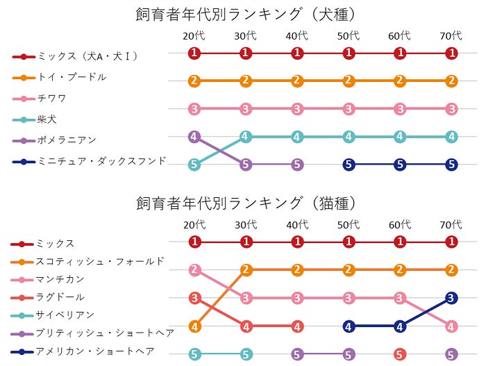 猫のランキングでは、20代~40代においてランク外の「アメリカン・ショートヘア」が50代~60代では4位、70代ではさらに順位を上げ3位にランクインしています。「アメリカン・ショートヘア」は総合順位で2017年の調査開始以来一貫して10位以内にランクインし続けていますが、50代以降の方に人気があるのがその理由だと考えられます。そのほか、猫のランキングにおいては20代~30代の若年層では「サイベリアン」、40代以降では「ブリティッシュ・ショートヘア」がランキングに姿を現しており、年代によって好む猫種に差異が生じているようです。