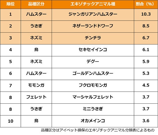 続いて、エキゾチックアニマル*⁴が対象となる当社のペット保険「うちの子キュート」*⁵へ加入いただき、契約が開始された小動物のランキングも発表いたします。