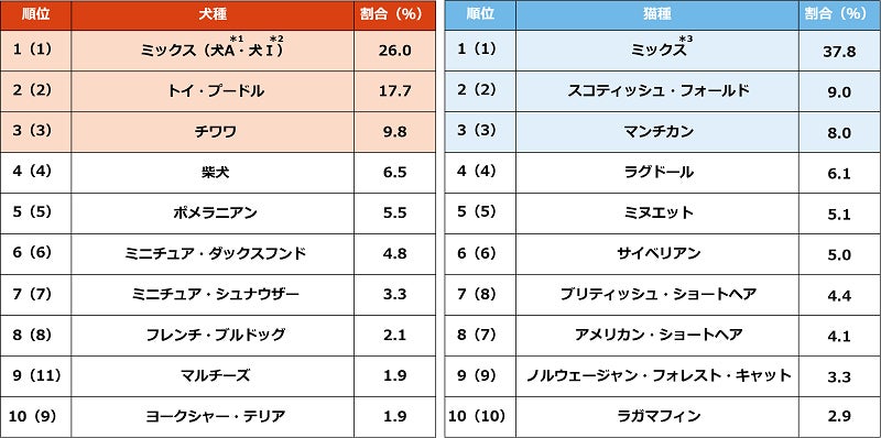 *3 ミックス(猫種):純血種同士を組み合わせている猫、日本猫、雑種の猫を含みます