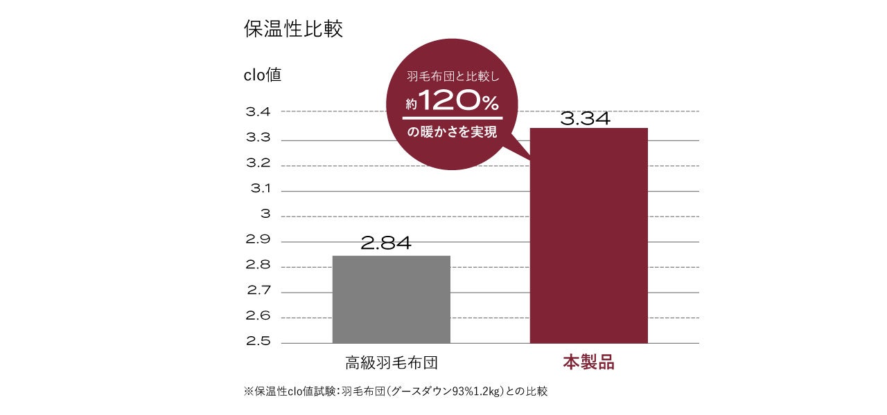 羽毛布団の中でも高品質と言われるグースダウン羽毛布団と比較して、約120%の保温性を実現しました。