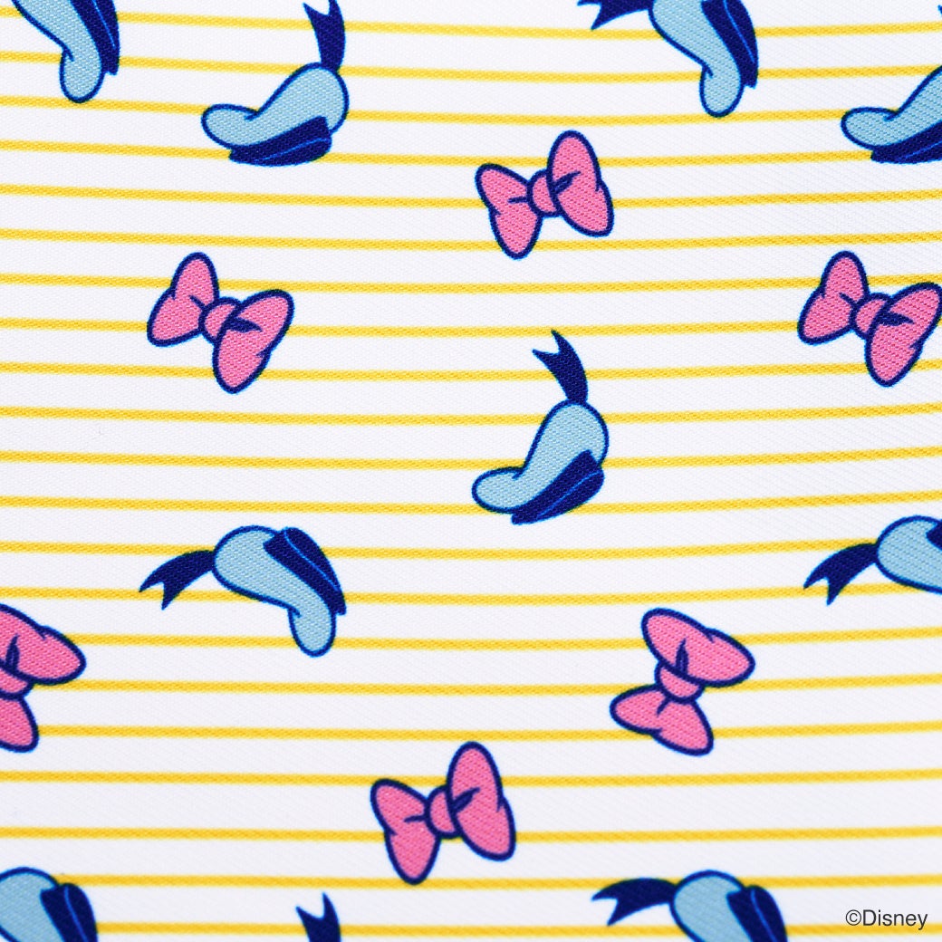 内側はイエローのボーダーに「ドナルド」のセーラーキャップと胸元のリボンを総柄にしたオリジナルアート。バッグを使うたびに内側からも元気をもらえそう♪