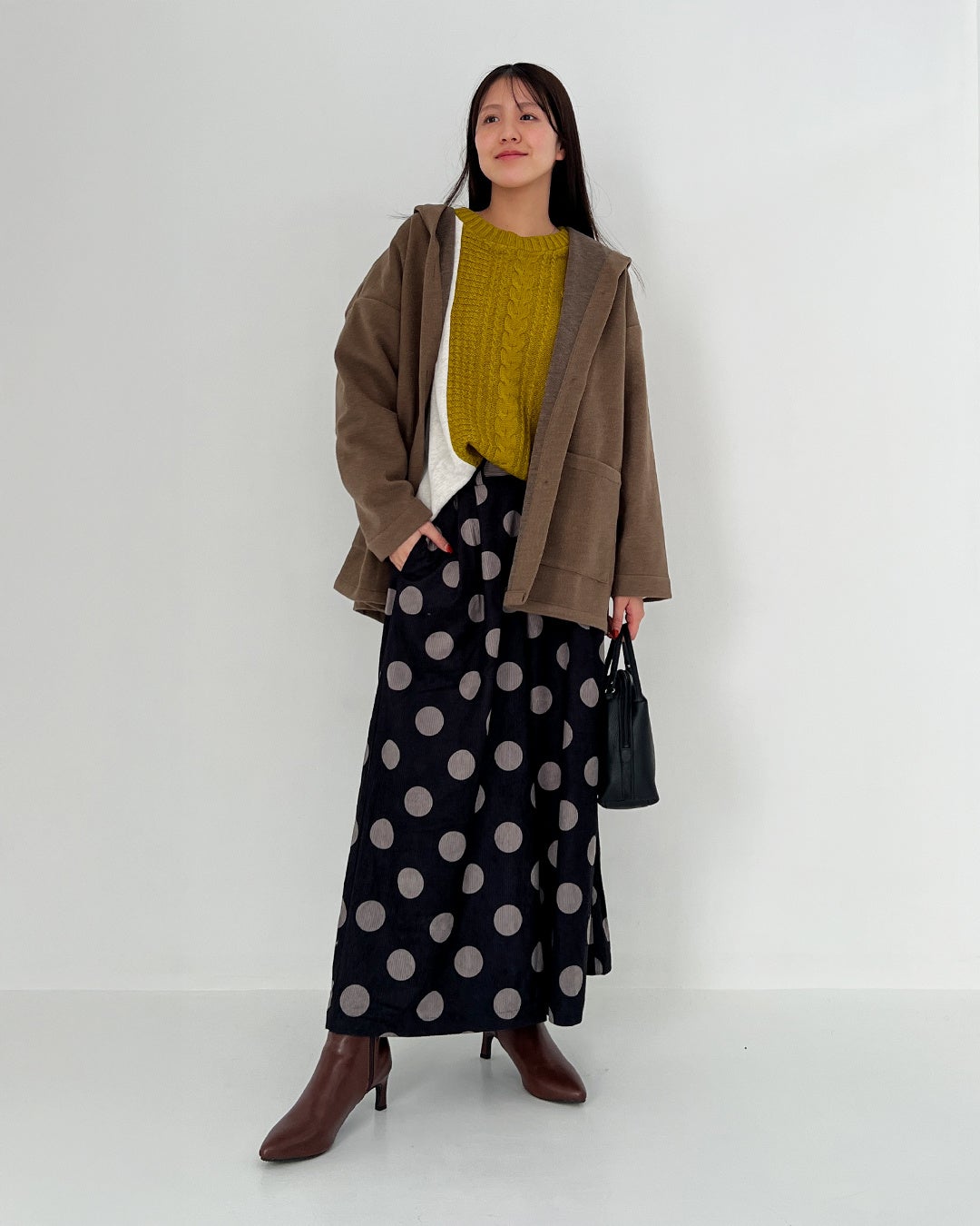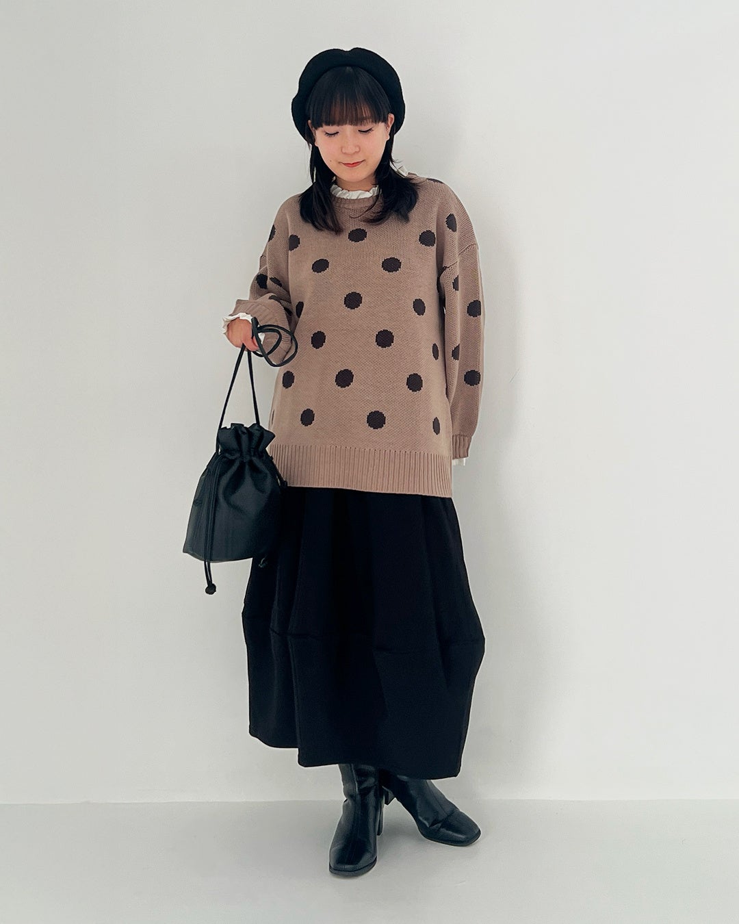 目を引く大きなドット柄や、ふんわりとしたボリュームシルエットが特徴。甘さを抑えた落ち着いたトーンで、大人の可愛らしさをナチュラルな質感で上品に仕上げました。鏡を見るのが楽しみになるような、心がふんわりと解ける華やかな一着をご提案します。