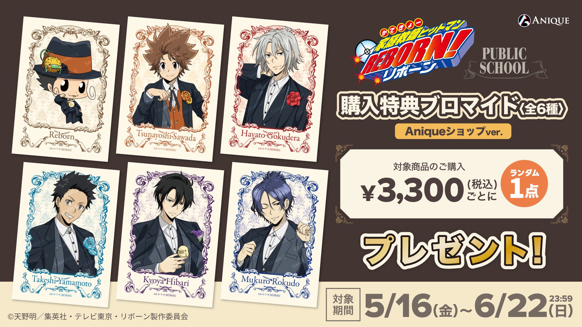 販売期間中、アニメ『家庭教師ヒットマンREBORN!』 対象商品を3,300円(税込)お買い上げごとにランダムで【購入特典 ブロマイド Aniqueショップver.(全6種)】を1枚プレゼントいたします。