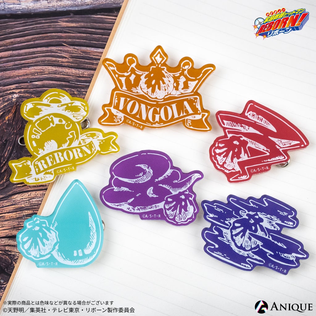 ボンゴレファミリーたちの属性やおしゃぶりをアイコン化した、オリジナルモチーフデザインのアクリルバッジです。