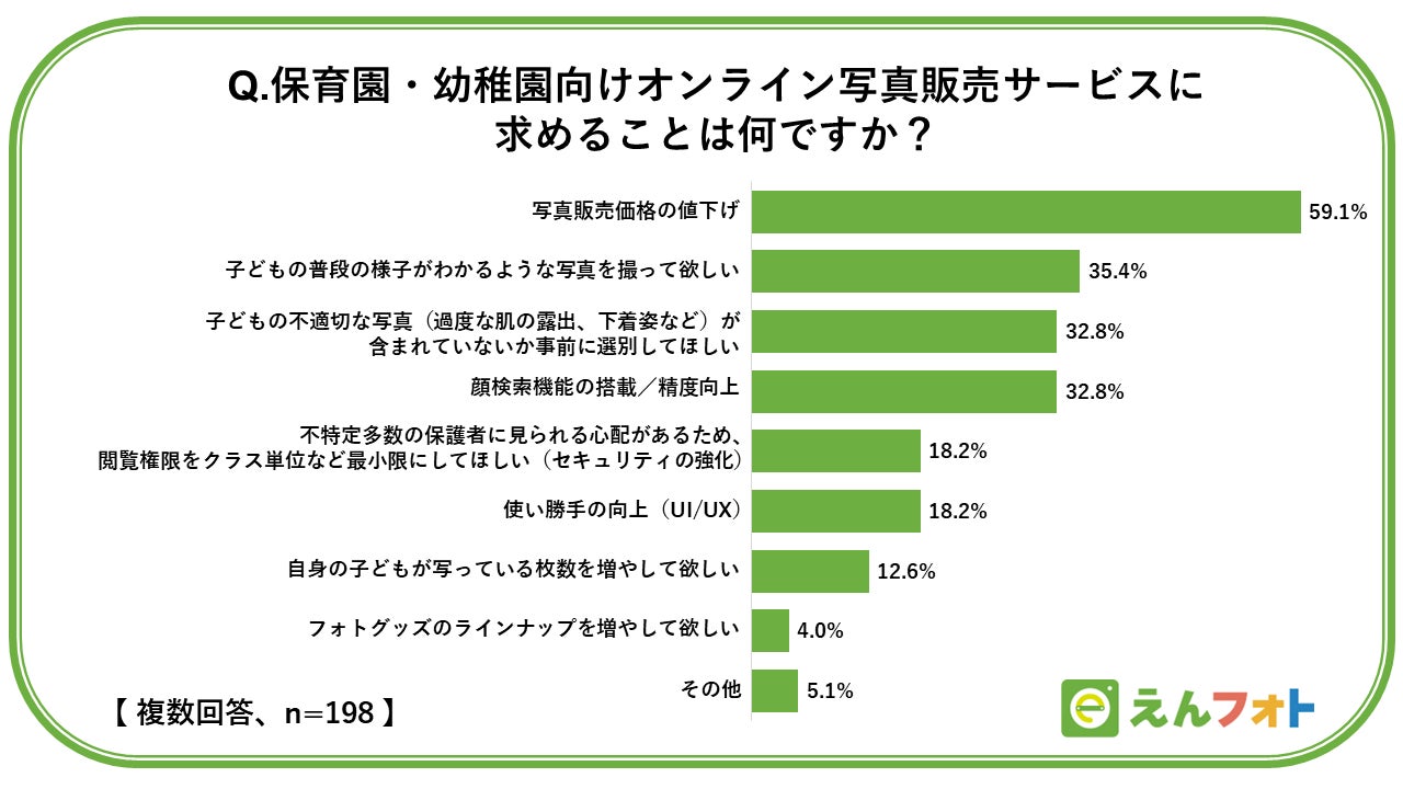 サービスに求めることは「写真販売価格の値下げ」が59.1%で最も多い結果に。子どもの不適切写真の事前選別を求める親は3割強(32.8%)。<結果5>