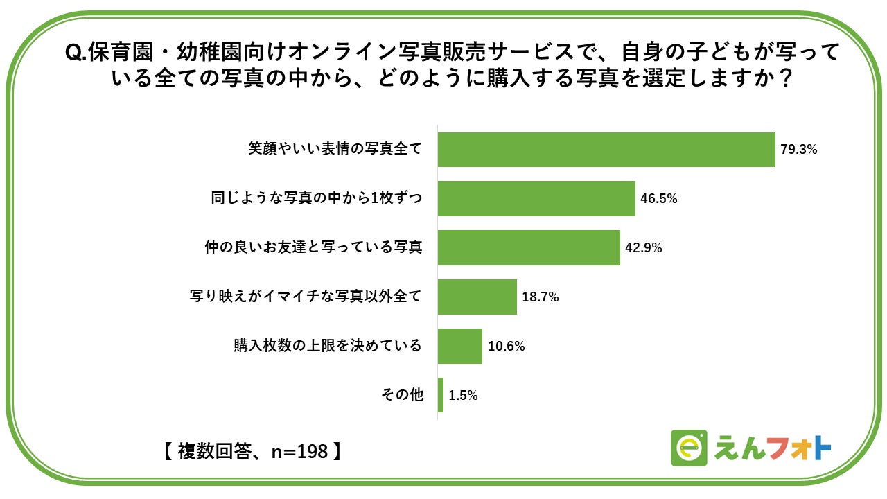 購入写真の選定では親の約8割が「笑顔やいい表情の写真全て」(79.3%)を基準にしている。<結果6>