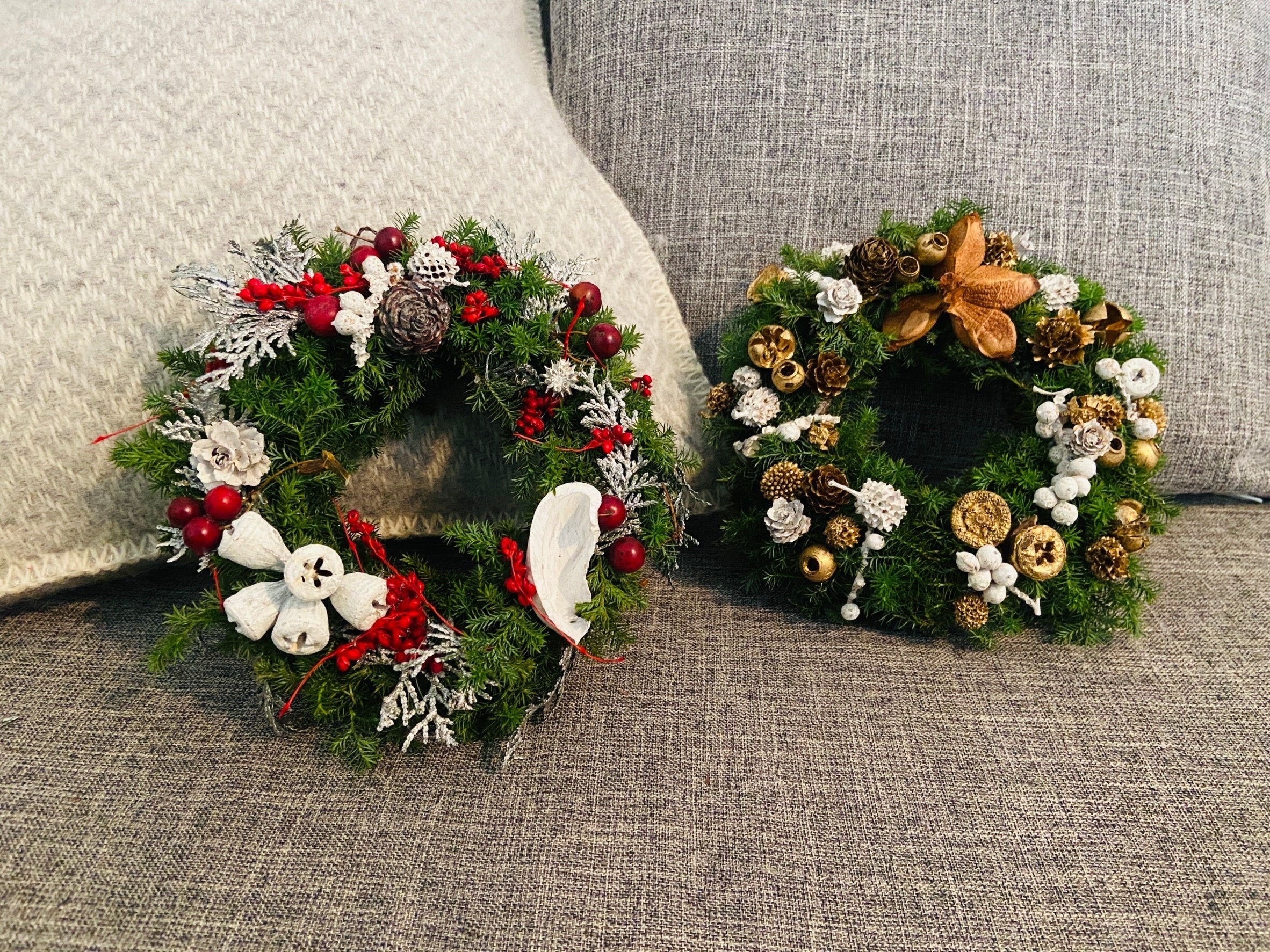 植物の豊富な知識と経験をもとに、店舗や住宅の植栽、定期レッスンなど多岐にわたり活躍中。当日は、目黒本町のベーカリーFARINA店内GRAINESにて販売している温かみのあるクリスマスリースやグリーンのインテリアなどをラインナップ。
