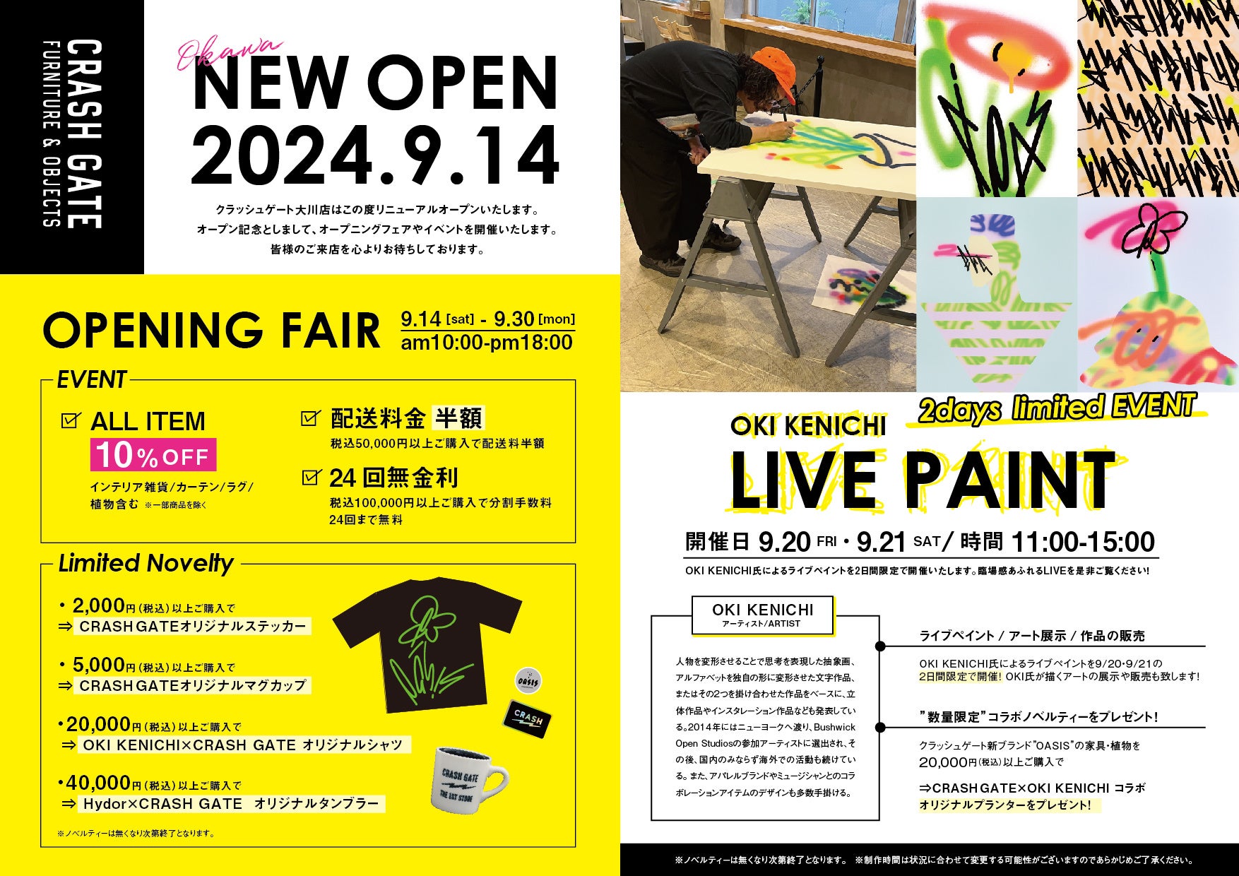 沖賢一氏が描くアートの展示&販売や、新ブランド「OASIS」の家具・植物をお買い上げのお客様にオリジナルコラボノベルティをプレゼントも実施。