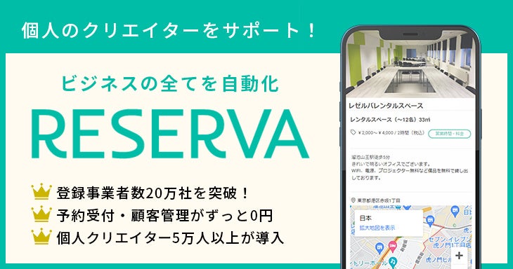RESERVA(https://reserva.be/)は、レンタルスペース、ヘアサロン、旅館、スクール、イベント、自治体、医療機関など20万社以上で導入。個人のクリエイターもサポート!