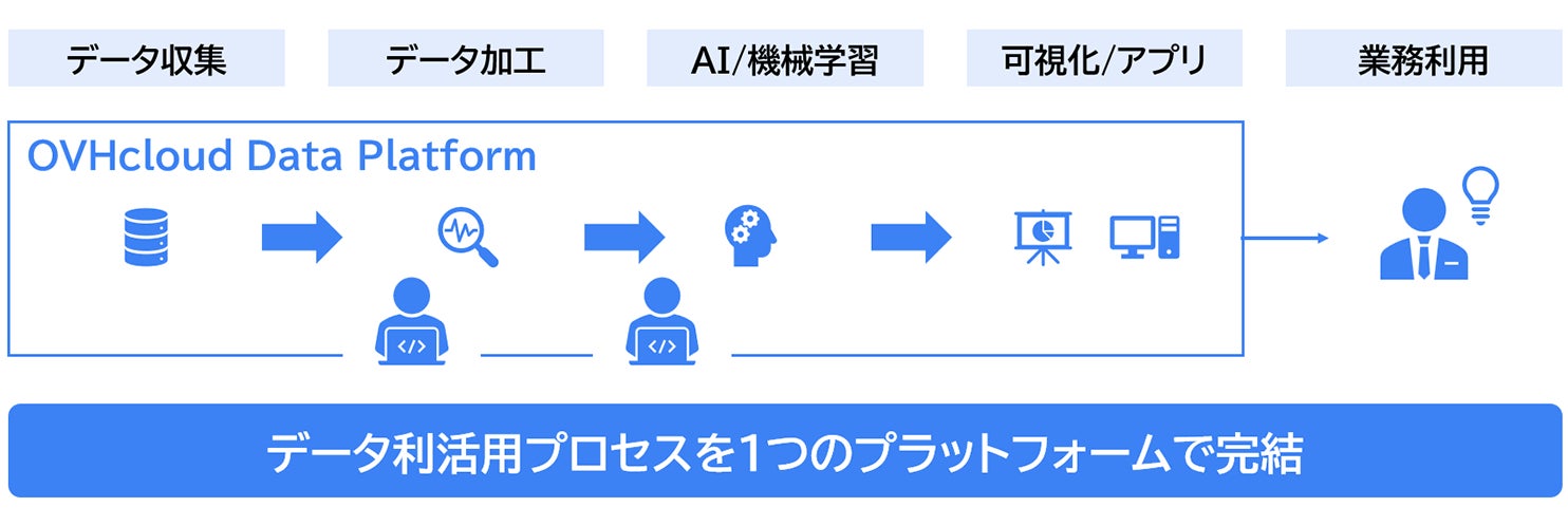 「OVHcloud Data Platform」(以下 本プラットフォーム)は、「データ収集」「データ加工」「AIモデリングと機械学習」「可視化」「アプリケーション開発」など、データ利活用に必要な基本機能をすべて保有するプラットフォームです。