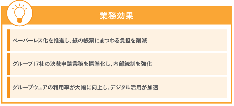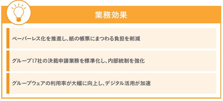 さらに各社ごとにバラついていたグループ17社の申請決裁業務を標準化し、グループ全体での業務効率化や内部統制の強化も実現