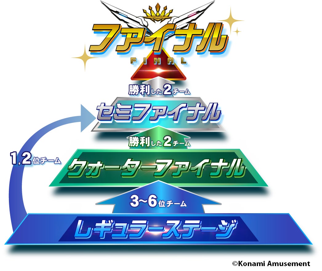 レギュラーステージは参加チーム8社を事前の抽選により「L」と「R」の2リーグに分け、リーグごとの総当たり戦を行います。その後、インターリーグ戦を行い、最終順位が上位の6チームが決勝トーナメントへ勝ち進みます。クォーターファイナルでは、レギュラーステージを勝ち上がった6チームのうち下位4チームが1試合ずつトーナメント戦を行い、勝者がセミファイナルに進出します。セミファイナルでは、レギュラーステージの上位2チームとクォーターファイナル勝者が対決し、勝ち上がった2チームがファイナルに進出します。