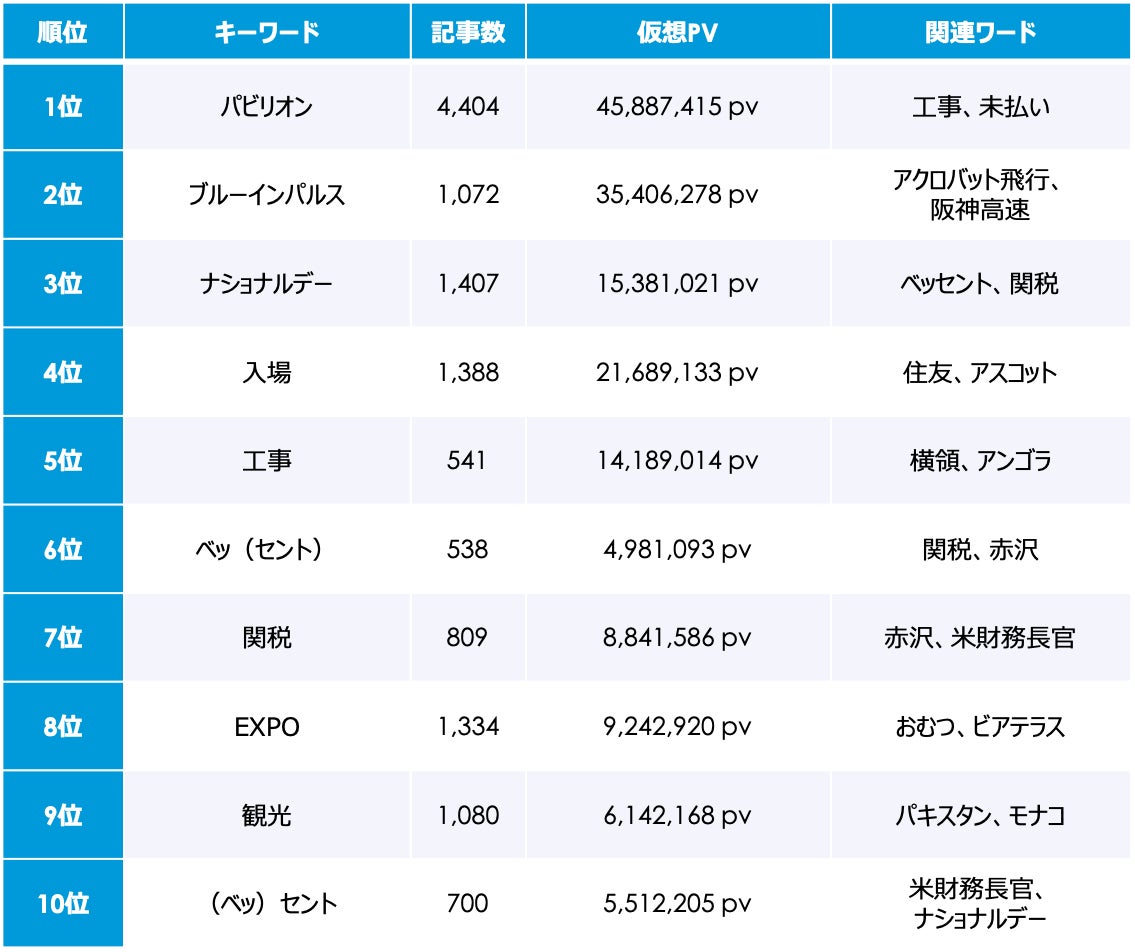 4位「入場」の関連ワードにある「住友」。これは住友グループのパビリオン「住友館」が、LINEアプリを使用した「抽選式デジタル整理券」システムを25日から導入するというニュースです。『ORICON NEWS』などが取り上げ、ポータルサイトなどへの転載も含めてPVを得ています。