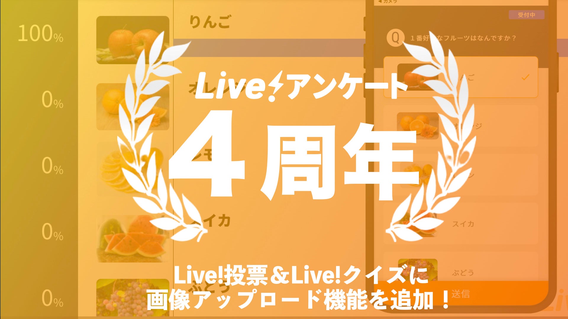 これまでの「Live!投票」「Live!クイズ」は、テキストベースの選択肢や質問に対して回答する仕様となっておりましたが、今回のアップデートで「画像」を追加できるようになりました。