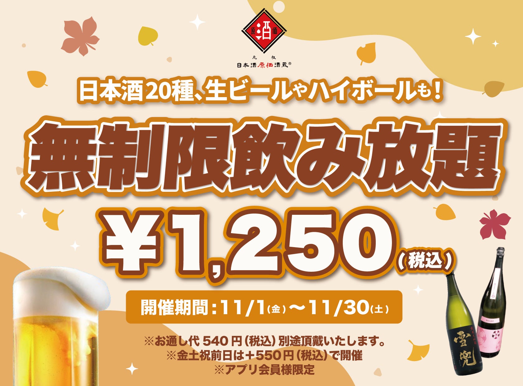 【最大11時間30種飲み放題¥1,250】日本酒原価酒蔵全店で時間無制限飲み放題¥1,250イベントを限定開催┃11月1日~11月30日