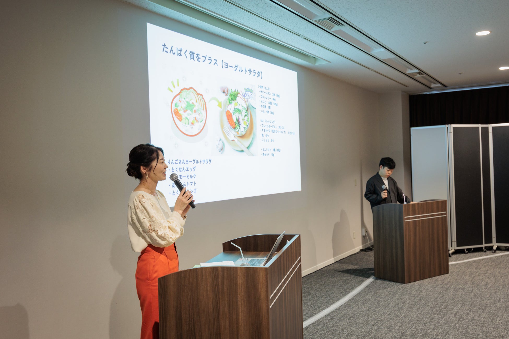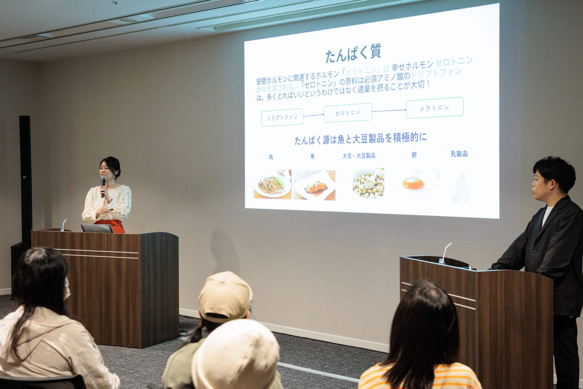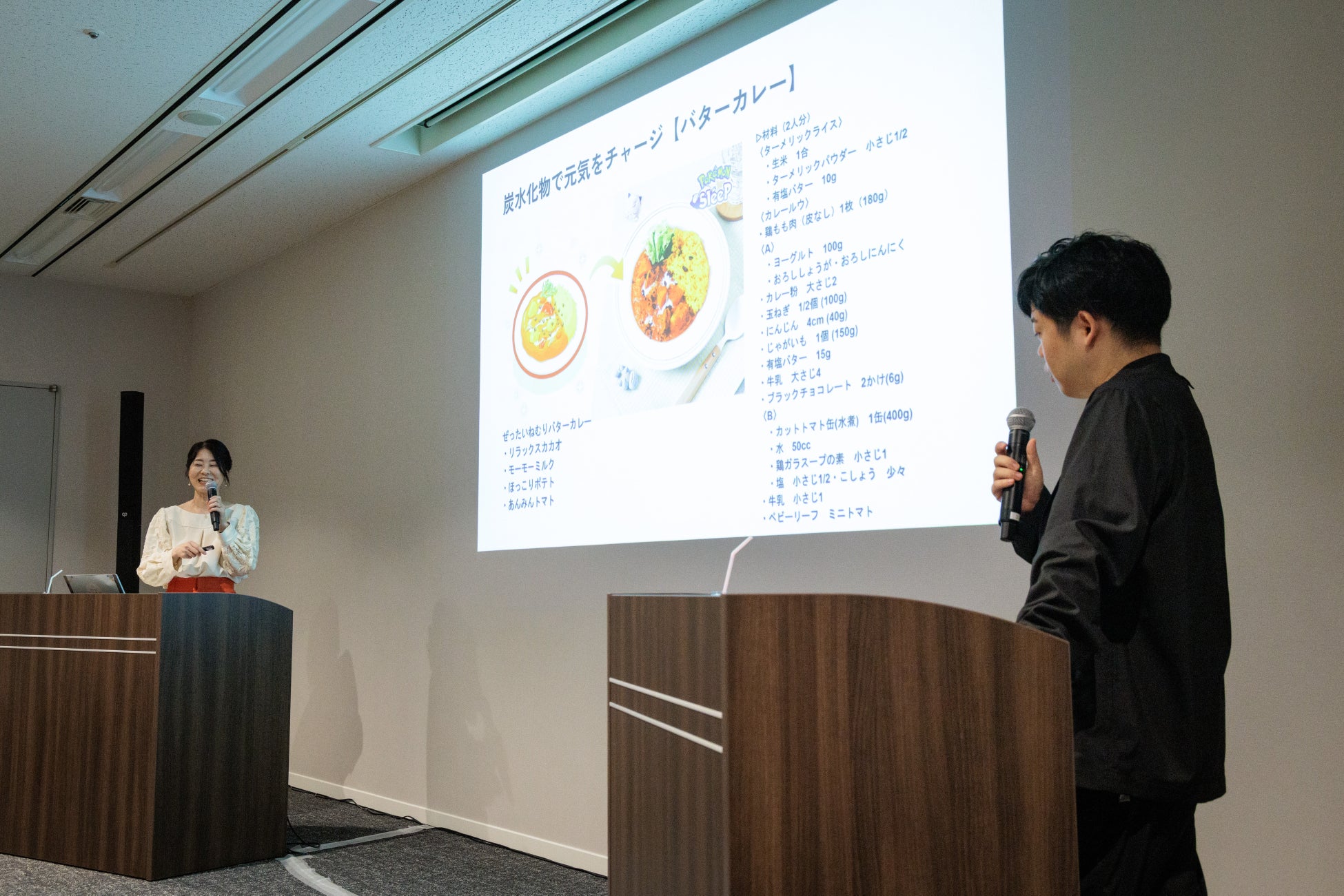 睡眠ゲームアプリ『Pokémon Sleep(ポケモンスリープ)』のプロデューサーを務める小杉 要 様に登壇いただき、当社取締役・管理栄養士の道江とのトークセッションを行いました。小杉様からは『Pokémon Sleep』『あすけん』『筑波大学』が共同で実施し、2024年8月に発表された大規模調査「栄養素と睡眠の関連性」から確認された傾向の解説や、“良いねむり”のための食事に関するTipsをご紹介いただき、道江からは本大規模調査内で「睡眠の質に影響を与える可能性が示唆された栄養素」である、たんぱく質・炭水化物・食物繊維を摂取することによるメリットや、具体的にどんな食材を食べたら良いかをご紹介しました。