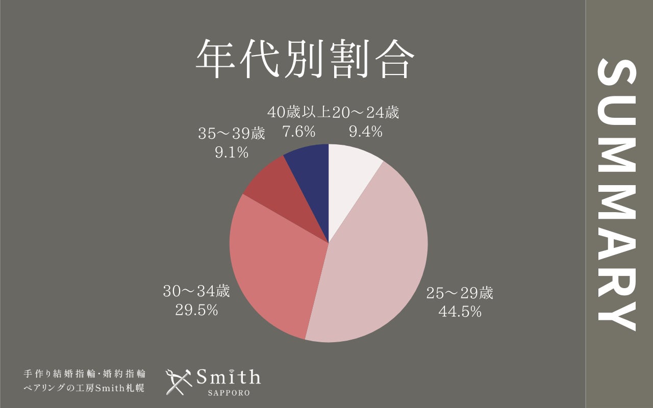 年間を通じて、25〜29歳(44.5%)が最多ボリューム層となりました。30代前半と合わせると全体の4分の3を占めており、情報収集能力が高く、自分たちらしい価値観を大切にする世代から圧倒的に選ばれています。 この層は、ブランドネームよりも「自分たちが制作に関わった」というストーリーや、「理想のデザインを追求できる」という体験価値を重視する傾向にあります。一方で、40代以上の層も年間を通して安定してご来店されており、落ち着いた空間で質にこだわった指輪作りを楽しみたい「大人婚」カップルのニーズにもお応えする結果となりました。