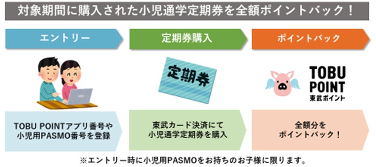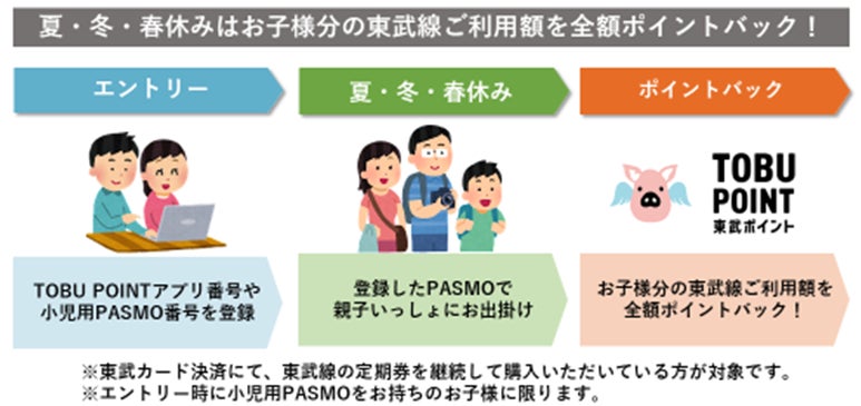 東武カードで東武線定期券を購入した方が、長期休み期間中、小児と同一区間を乗車すると、東武線内の小児運賃相当分を「トブポ」でポイントバックします。