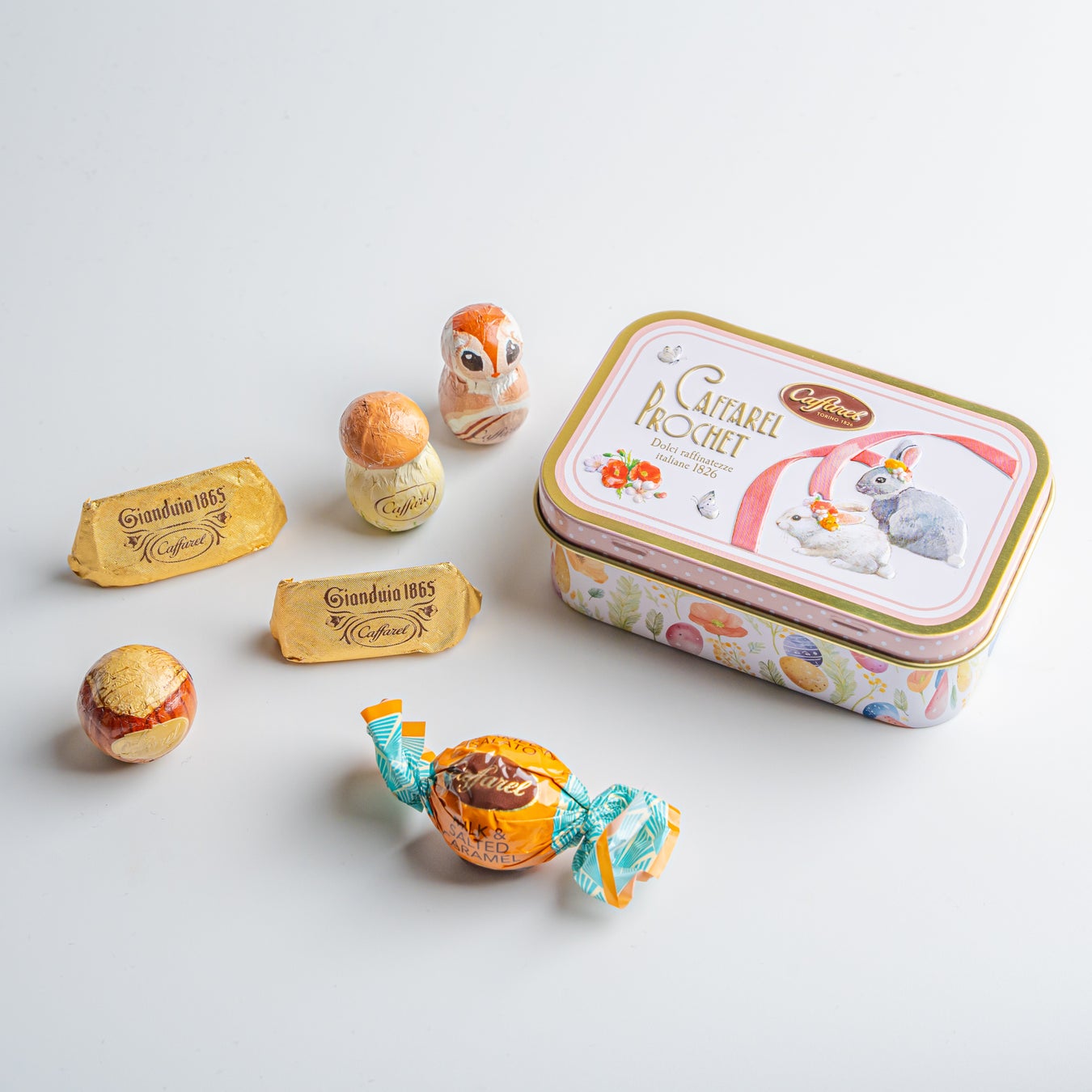 詳細:華やかなピンクがアクセントの蓋に、春の訪れを知らせる蝶々や花飾りをつけたうさぎ、ギフト感を演出するリボンがデザインされた春満載のプリマベーラシリーズ。コレクションに最適なミニ缶にはきのこやリスのホイルチョコレートや定番のジャンドゥーヤなど6粒がアソートされています。