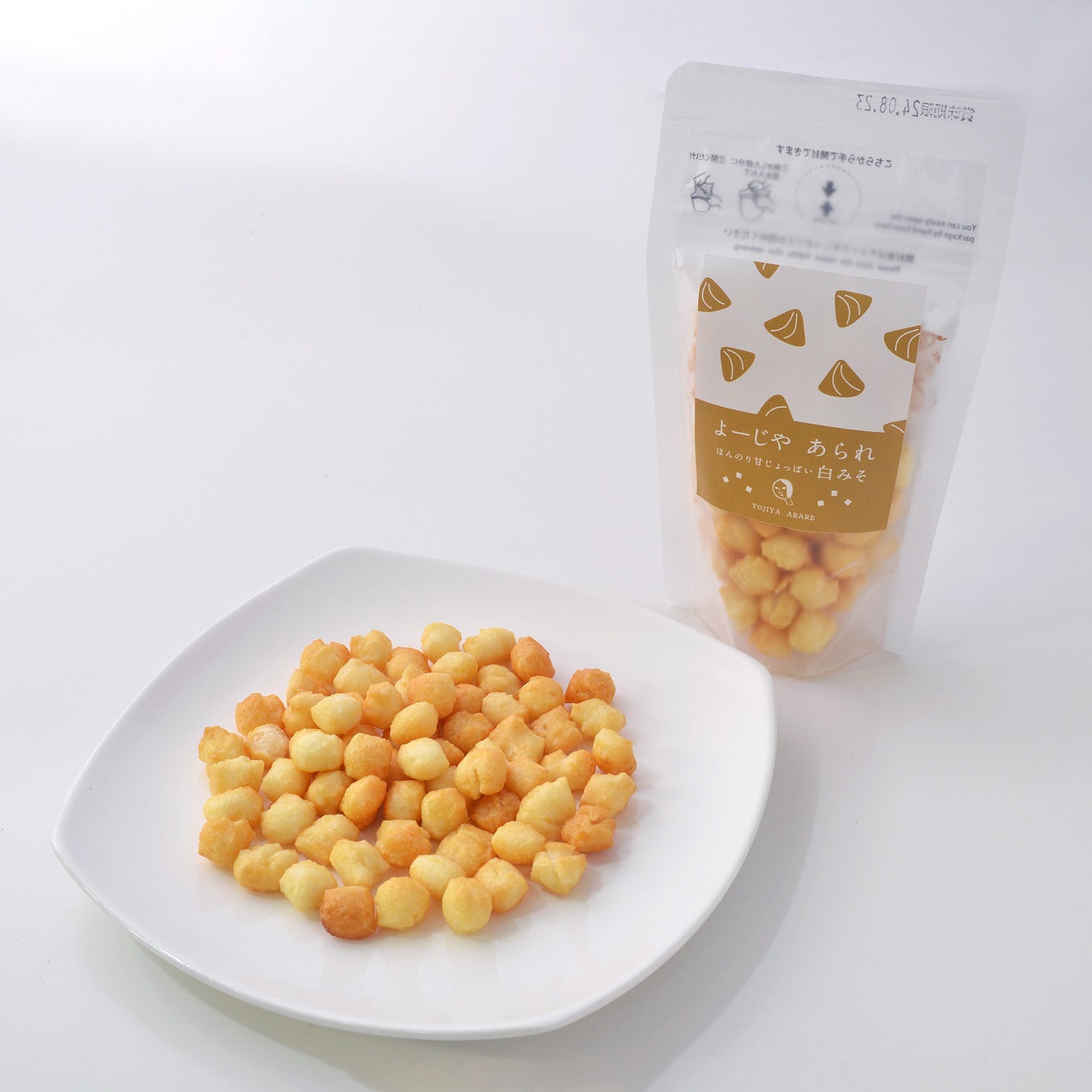 これまで弊社は、最中やクッキーなど手土産にぴったりなお菓子を販売しておりましたが、このたび5月1日(水)より「白みそ」と「七味」2種類の「あられ」を新発売いたします。