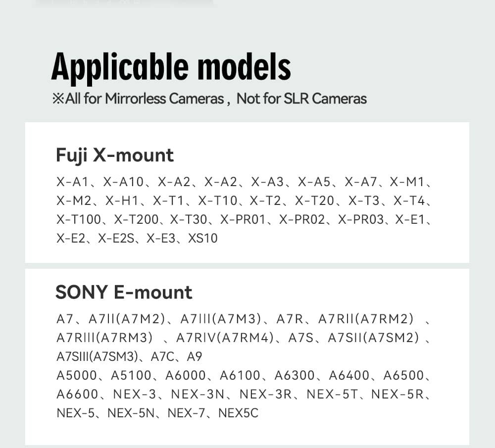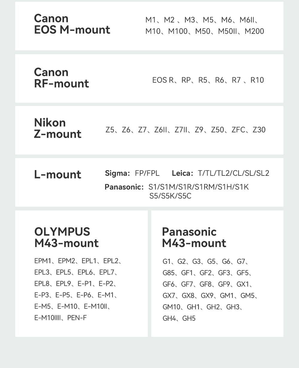 Nikon Z、M4/3、FUJI X、SONY E、キャノンM, キャノンRF,シグマ/ライカ/パナソニックLマウントを販売しております。
