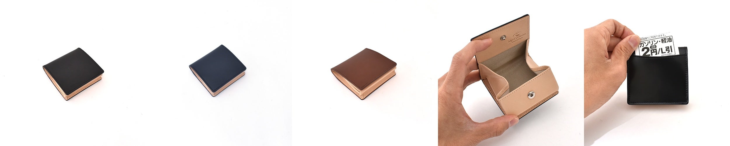 薄型でありながら小銭がたくさん入るボックス仕様。お札入れには隠しカードポケットつき。