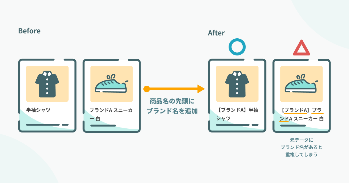 そのため、別項目にある「ブランド名」を商品名の先頭に追加するルールを作成するのが一般的です。しかし、元データの商品名に、ブランド名があるものと無いものが混在するとします。この場合、ルールで追加したブランド名が重複してしまいます。