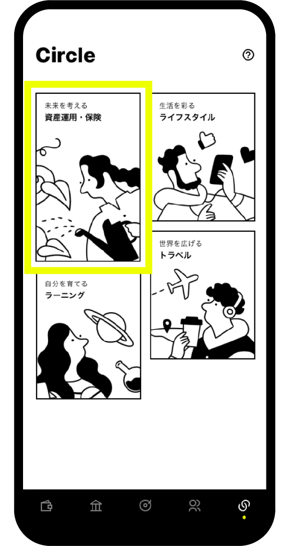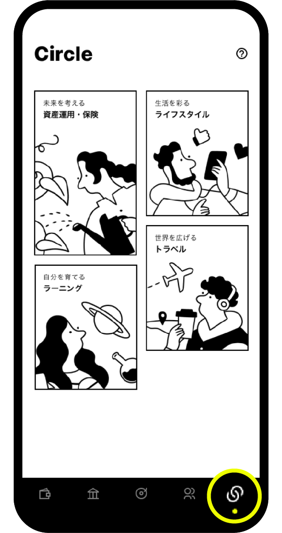 ①アプリ画面の一番右のアイコンをタップして、Circle画面に遷移