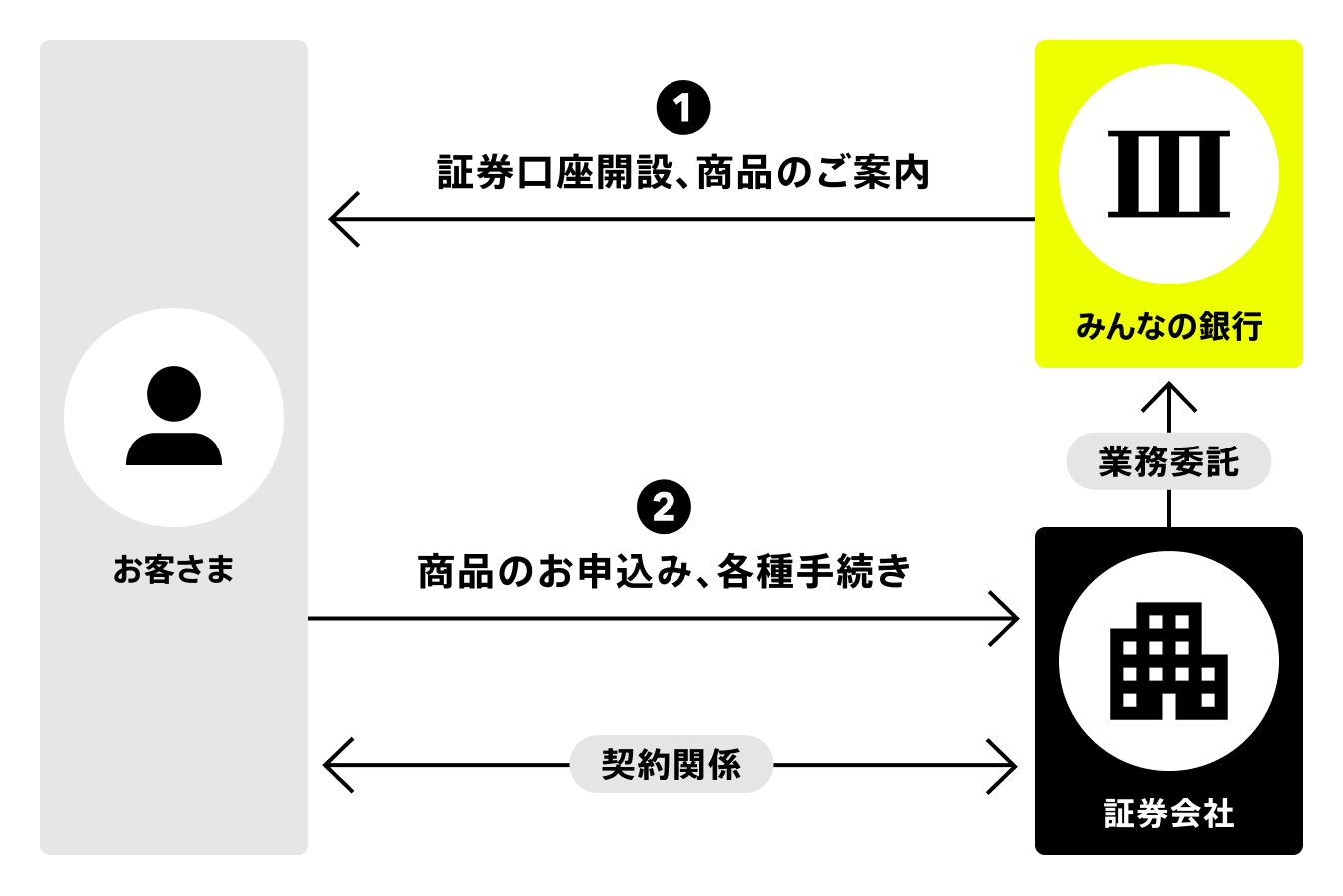 みんなの銀行は、オンライン証券会社の委託を受け、みんなの銀行アプリを通じて証券口座の開設を仲介します。