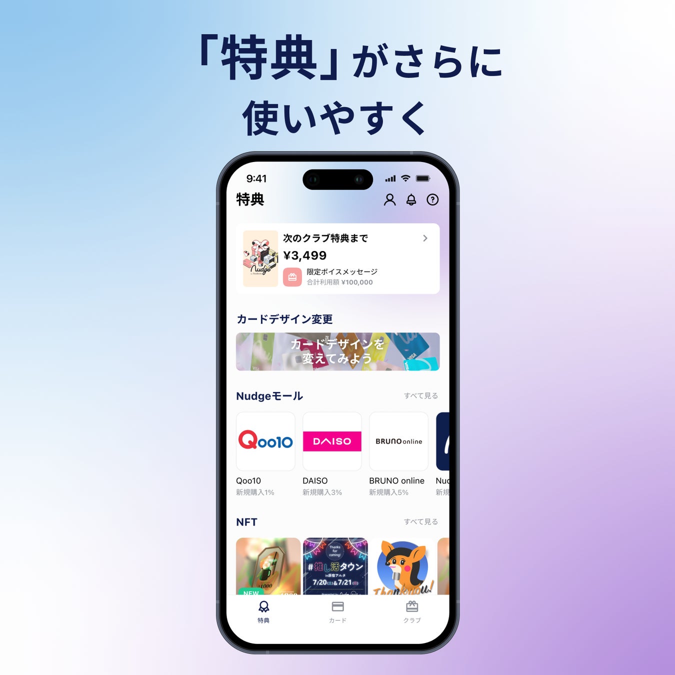 ナッジ株式会社(本社:東京都千代田区、代表取締役:沖田 貴史、以下「ナッジ」)は、2024年10月より、次世代クレジットカード「Nudge(ナッジ)」アプリにおいて特典機能を強化した新UIへリニューアルいたしました。これにより、ユーザーは、Nudgeアプリのホーム画面上で自身が選択した推しの「クラブ」(※1)の特典確認や、カードデザインの変更等がスムーズに行えるようになりました。