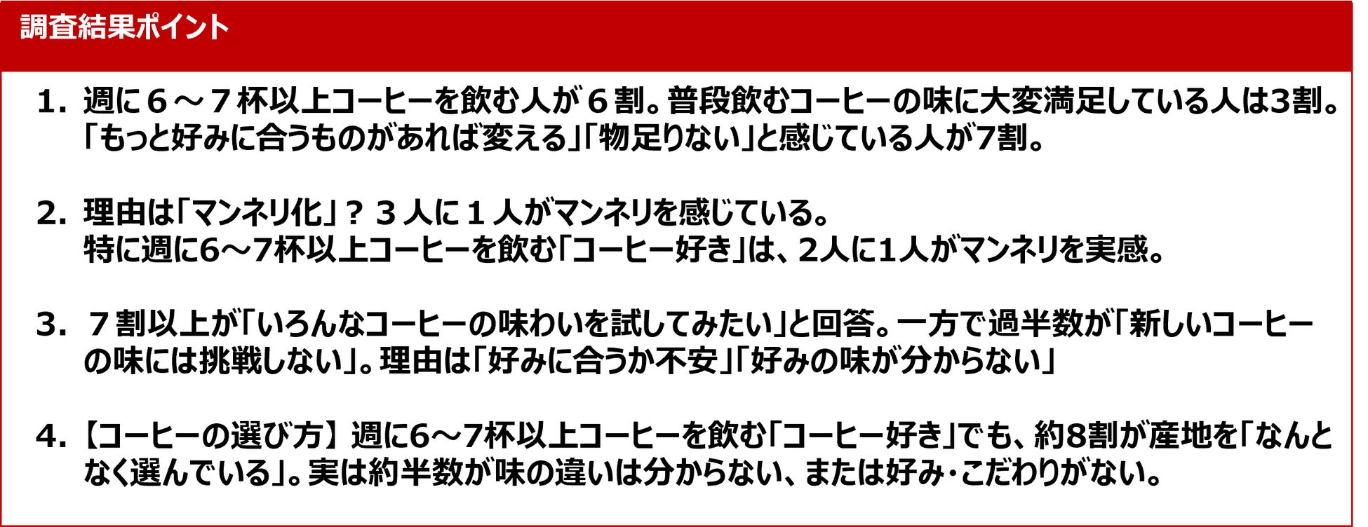 普段コーヒーの飲用習慣のある20代から50代にアンケート調査を行いました。調査の結果、普段飲んでいるコーヒーに大変満足している人は3割以下にとどまり、「もっと好みに合うものがあれば変える」「物足りない」と感じている人が多いことが分かりました。最も多い理由は「マンネリ化」で、特に週に6~7杯以上飲む「コーヒー好き」は、2人に1人がマンネリを感じていました。実際、「いろんなコーヒーの味わいを試してみたい」人は大半以上であるものの、「味で失敗したくない」という不安や、「産地はなんとなく選んでいる」「味の違いは分からない、好み・こだわりがない」といった背景があるために、新しい味わいを選べない人が多くいることも分かりました。