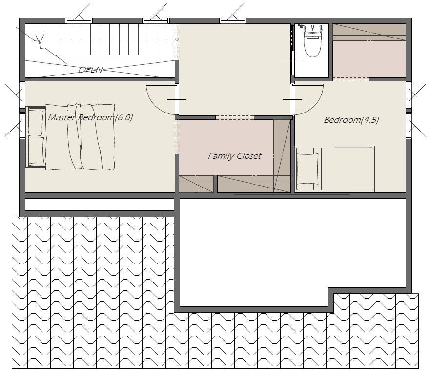 外観デザインの象徴ともいえる大屋根デザインのハングアウトルーフ。屋根裏にロフトをつくること、また外壁とのバランスを考え、素焼きのオレンジの洋瓦の大屋根と落ち着いた白壁のコントラストのデザインとなっています。