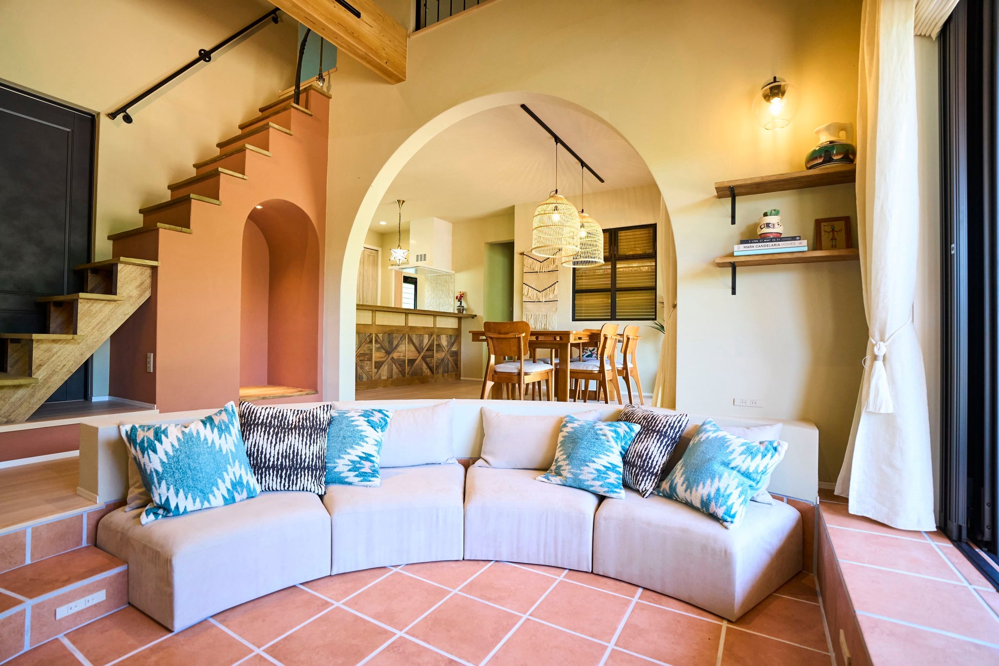 リビングとダイニングを緩やかに分ける厚みのあるセンターアーチを配置しています。牧歌的なデザートスタイルの様式美を反映させたデザインで、塗り壁で仕上げることで風合いも増し、温かみを感じられる空間を演出します。