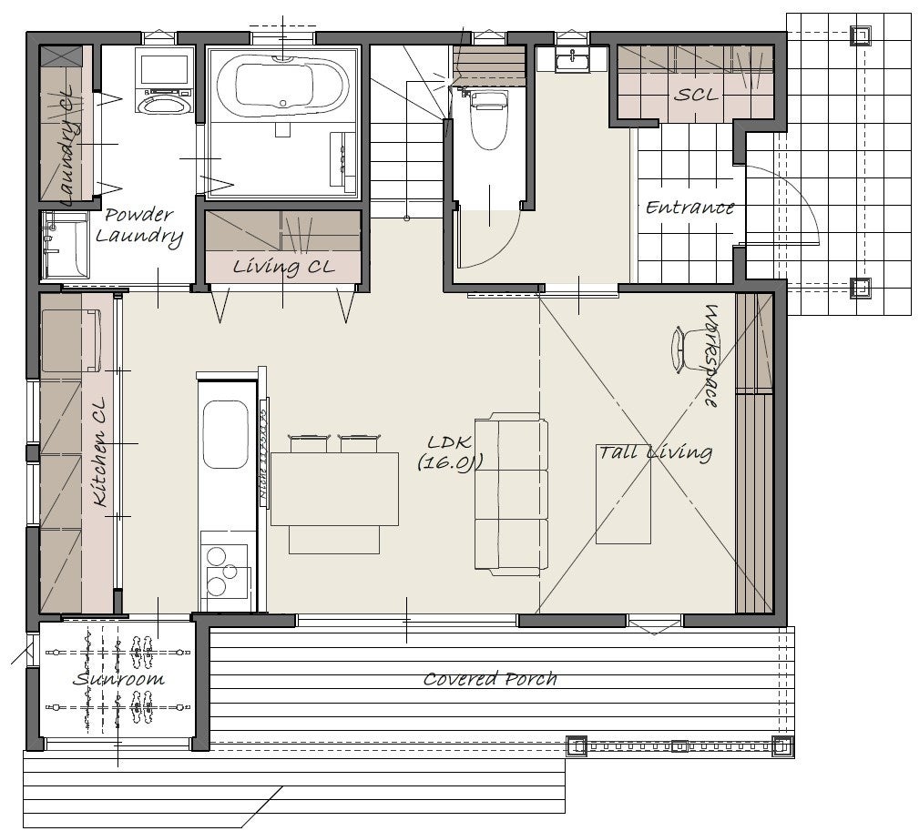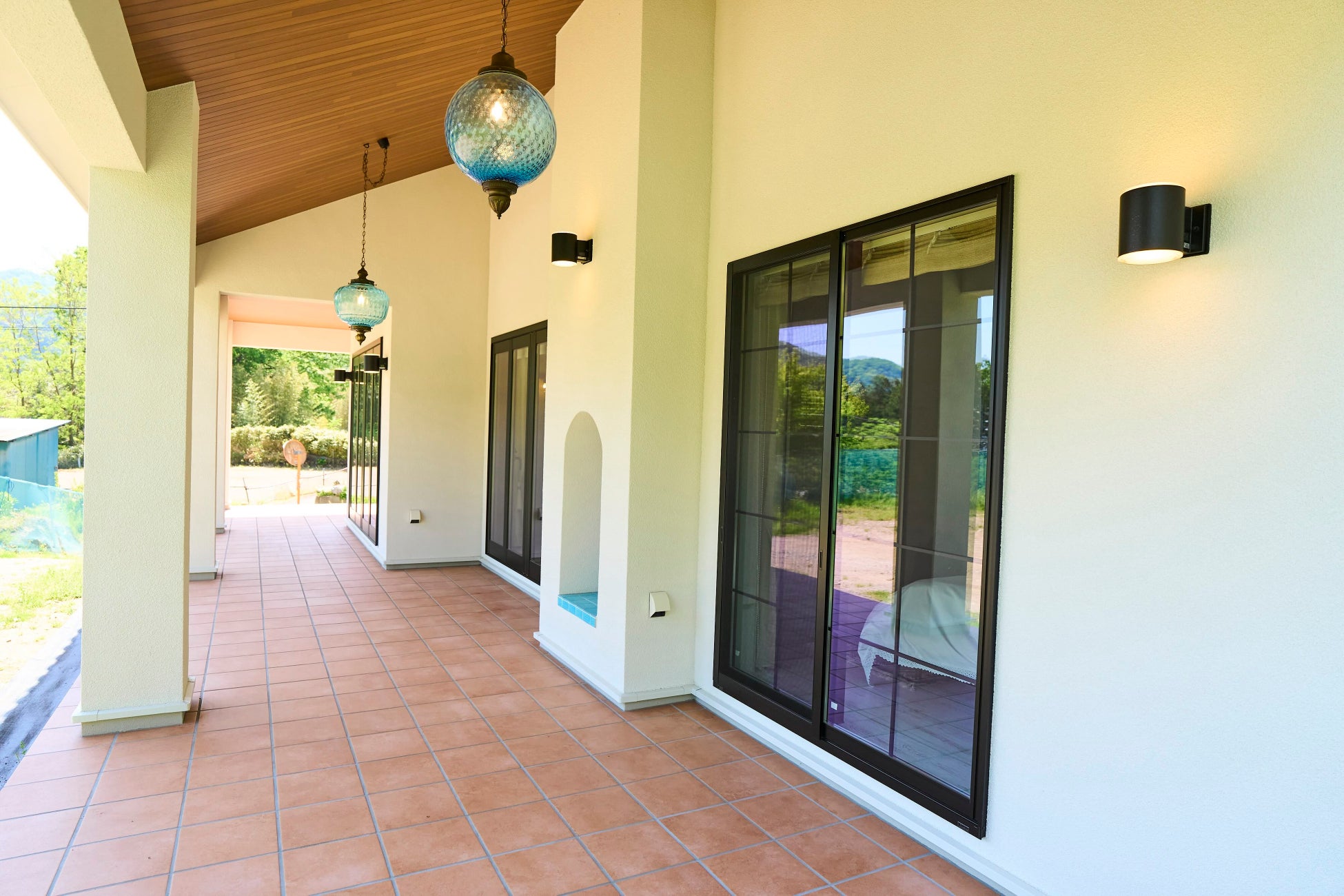 リビングと庭をつなぐ軒下は、カリフォルニアスタイルのカバードポーチよりも奥行きを設け、丸ごと一部屋あるような空間です。ダイニングテーブルを置いて食事を楽しむなど、いろいろな使い方ができます。