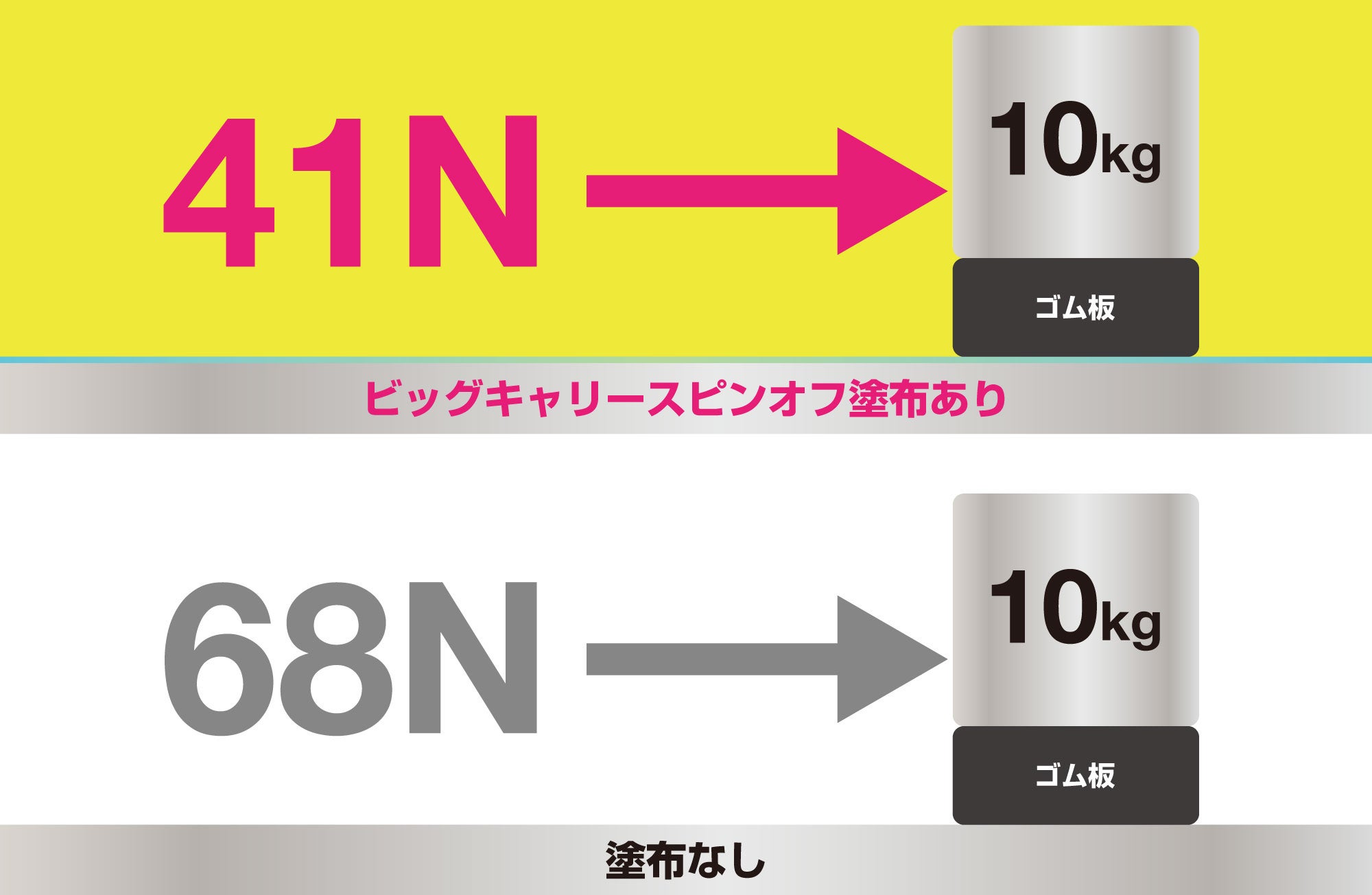 試験の結果、最大荷重が少ない「ビッグキャリースピンオフ」は塗布前に比べて摩擦抵抗が少なく、インパクトの際にクラブフェイスがボールに当たった時のボールに対する摩擦も軽減されると推察される結果となりました!