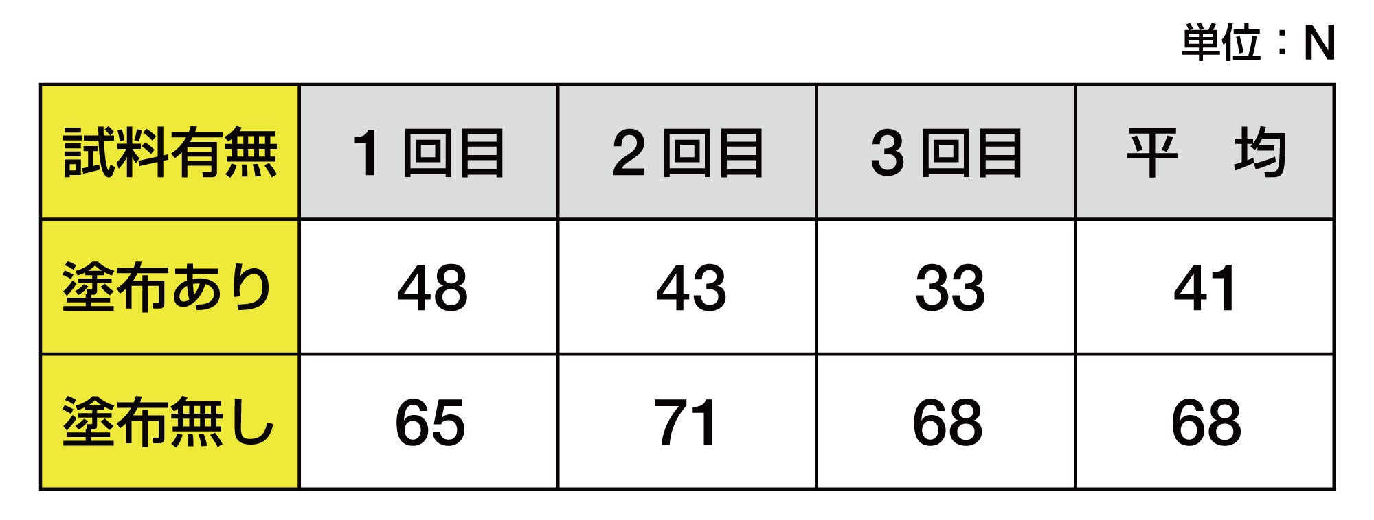 ステンレス鋼(No2B仕上げ)のスライドステージに25mm角のゴム板(厚さ 10mm)を置き、ゴム板に10kgのおもりを載せた状態で、スライドステージを10mm/minの速度で10mm移動させた時の最大荷重を塗布前と塗布後それぞれ調べました。