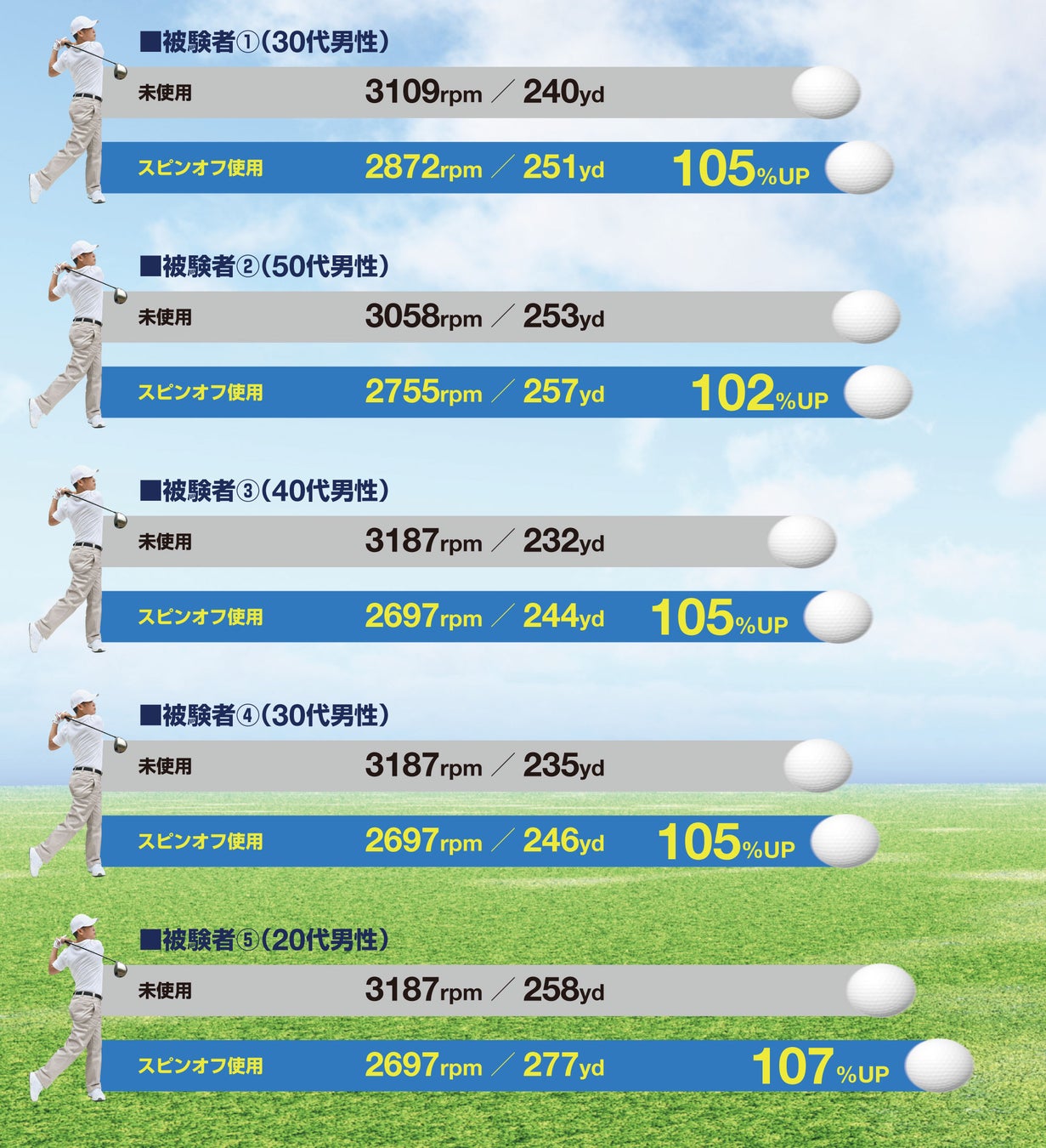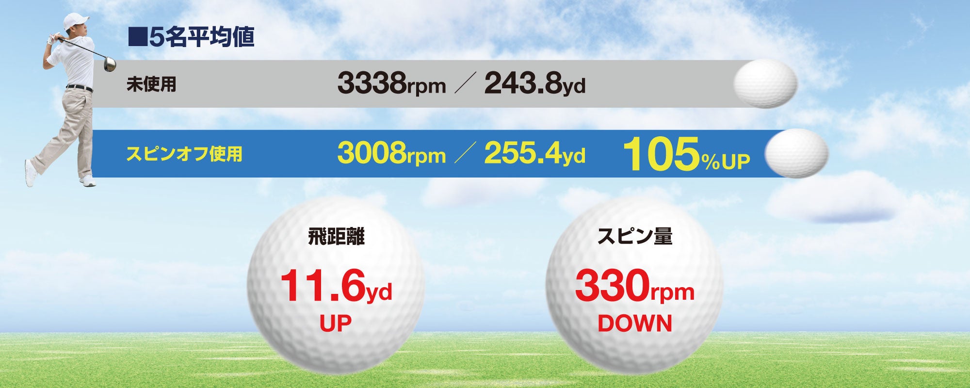 被験者5名の結果:塗布前と塗布後を比べると、平均飛距離が約11.6yd上がり、スピン量は平均約330回転抑えられ、理想値である約2,500回転に近づく結果となりました!