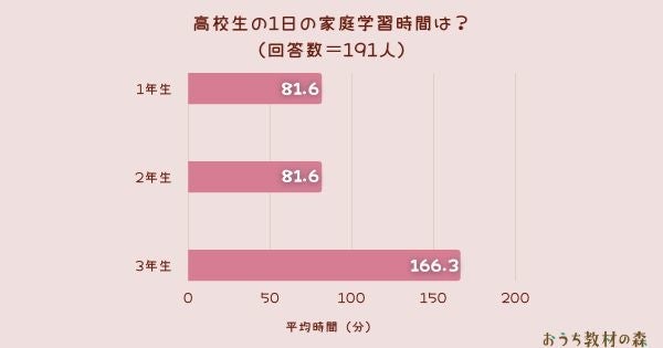 ・2時間〜3時間(8人):高校では宿題が多いので家又は塾で勉強しないといけません。将来大学へ行きたい目標があるので時間があれば塾で自習します。