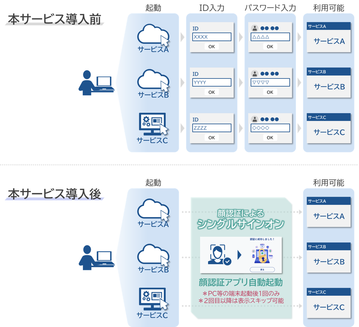 IDとパスワードによる認証の代わりに顔認証を用いることで、パスワードレス化を実現。システムごとのパスワードを覚える煩わしさから解放され、利用者の利便性を向上します。パスワードの管理にまつわる運用負荷も軽減します。
