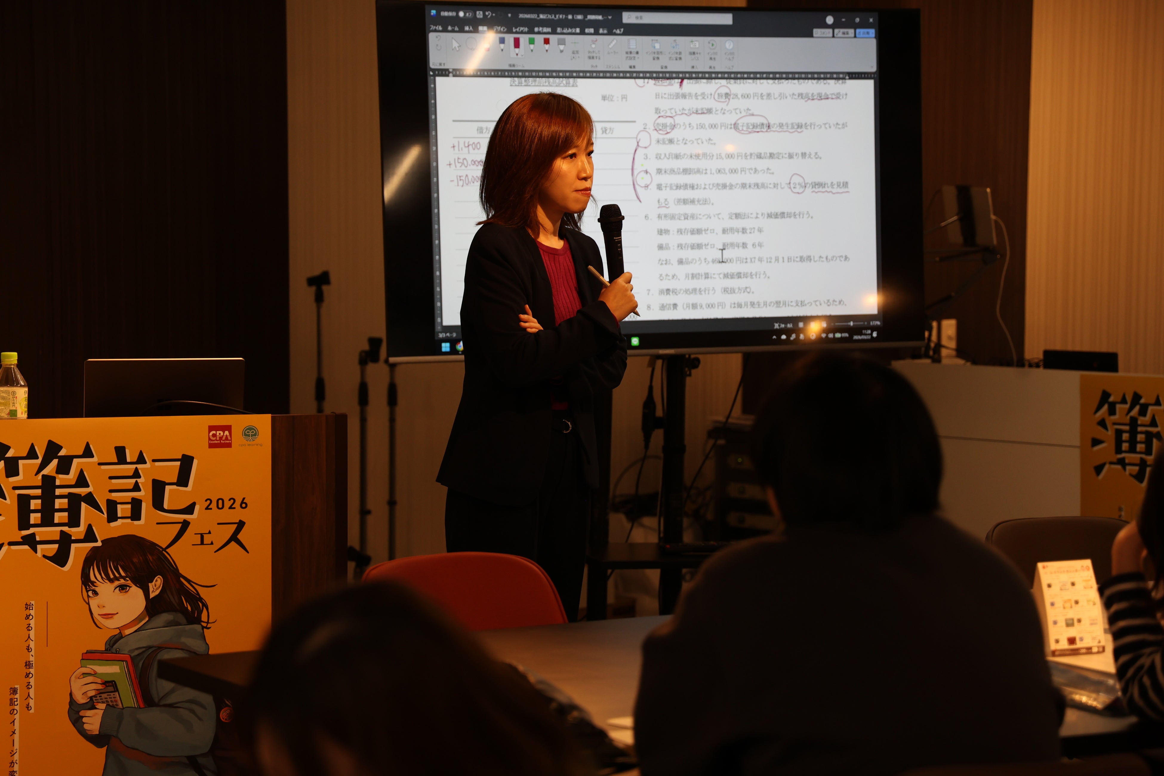 ビギナー級(簿記3級レベル)の解説を担当した柴本玲菜講師は、「仕訳を単なる暗記で済ませない」ことの重要性を説きました。商品の流れをストーリーとして捉える思考法を伝授し、特に多くの受験生がつまずく売上原価の算出(し・くり・くり・し)について、「期首+仕入-期末=売れた分」という根本的な構造を丁寧に解説しました。また、実戦テクニックとして「仮払金などの未確定勘定は、決算で見つけた瞬間に消す処理をする」といったスピードアップの秘訣も披露されました。