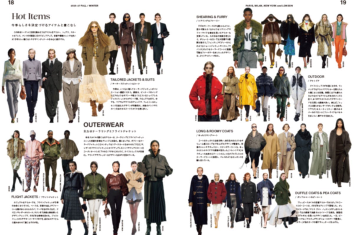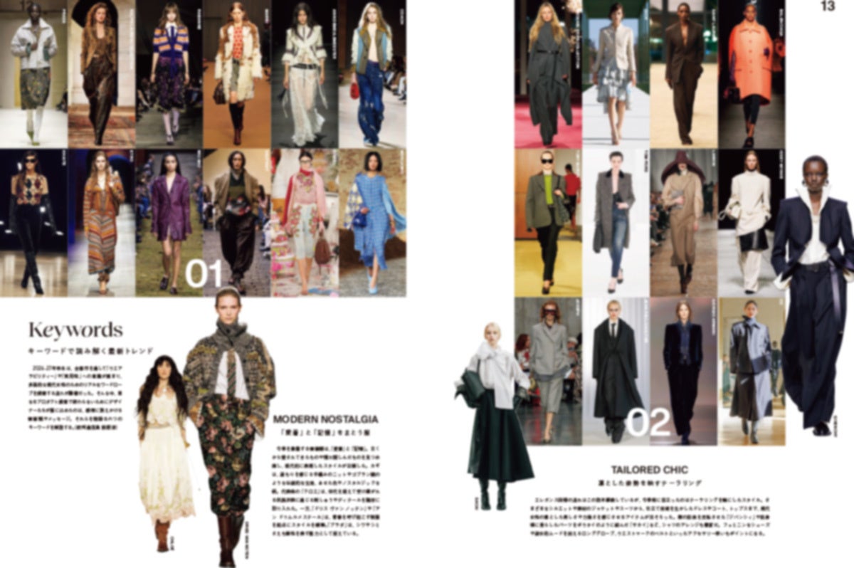 今回もパリとミラノ、ニューヨーク、そしてロンドンのファッション・ウイークでかき集めた数百枚の写真と共に、今シーズンのムードやアイテム、素材、色柄、ディテール、バッグ&シューズを筆頭とするアクセサリーなどのトレンドを分析。同時にトレンドを形作る潮流を読み解くためのデザイナーやバイヤーへのインタビュー、コラムなど、盛りだくさんの内容でお届けしています。