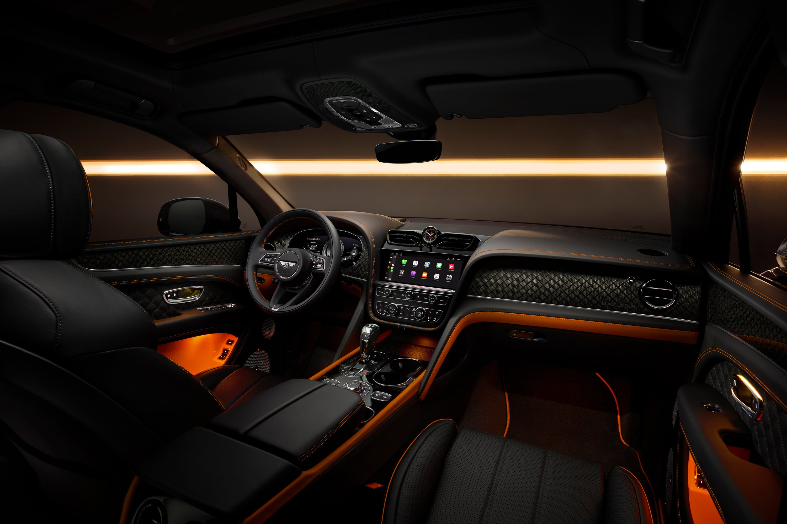 ベンテイガSブラック エディションのためにベントレーのデザインチームが考案した専用のインテリアカラーレイアウトでは、深みのある「Beluga」のレザーと鮮やかなアクセントカラーが完璧なコントラストを生み出します。ハンドクラフトされたインテリアを彩るコントラストステッチとコントラストパイピング、そしてレザートリムのアクセントカラーセクションにエクステリアと同じ鮮やかなアクセントカラーを採用し、エクステリアと一体感のあるビビッドな印象のキャビンに仕上げます。各シートには「S」のエンブレムがブラックで刺繍されます。