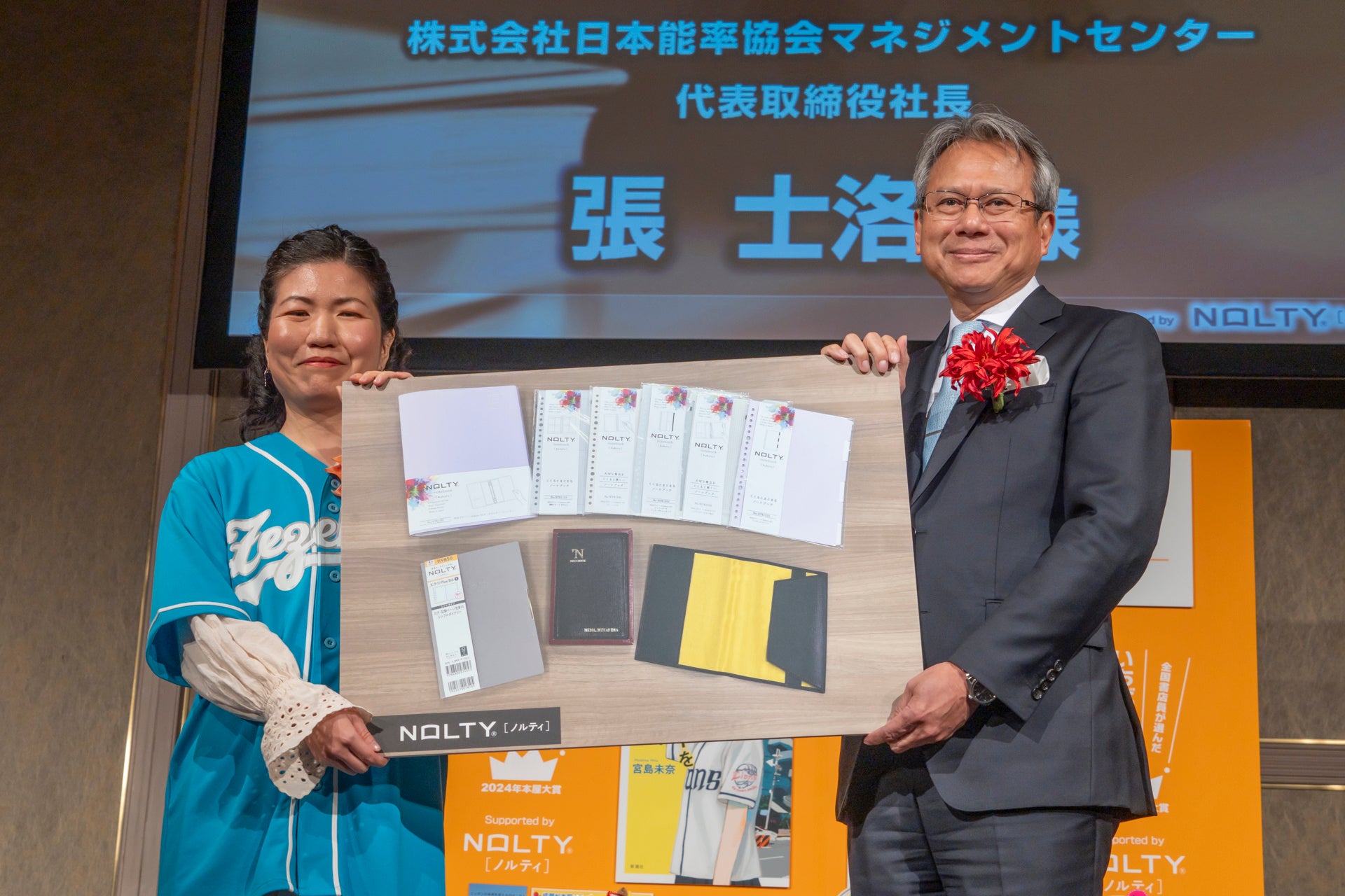 本年は宮島未奈氏の『成瀬は天下を取りにいく』(新潮社)が大賞を受賞し、当社代表の張より、お祝いの言葉と共に、副賞として「NOLTY能率手帳ゴールドメモティ」「NOLTYノートブック各種」「本革ブックカバー」「4月始まり NOLTY手帳」を贈呈しました。