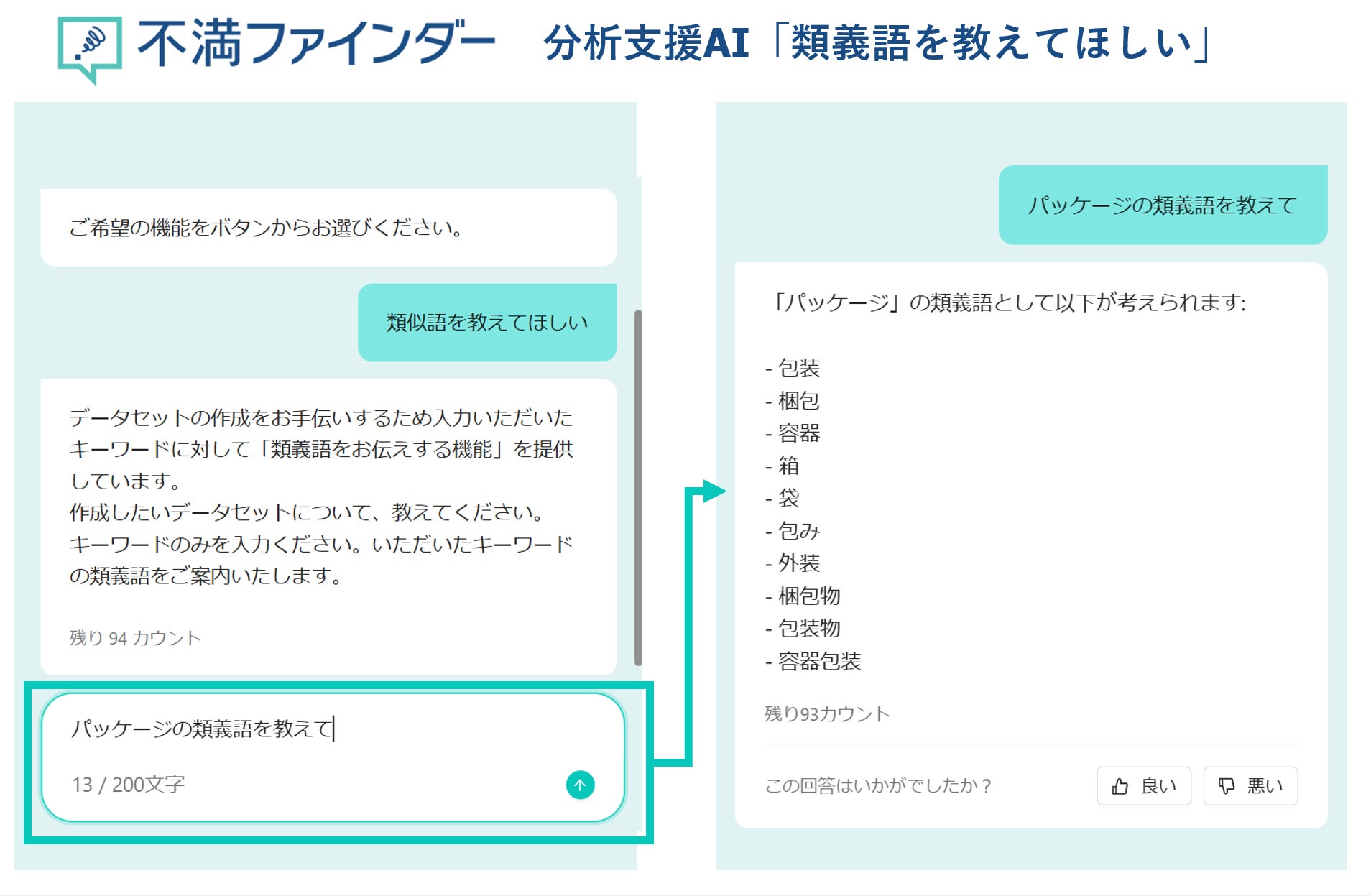 そこで、分析支援AIに「〇〇の類義語を教えて」というように投げかけることで意味合いが類似する類語を提案してもらえる新機能「類義語を教えてほしい」をリリースしました。