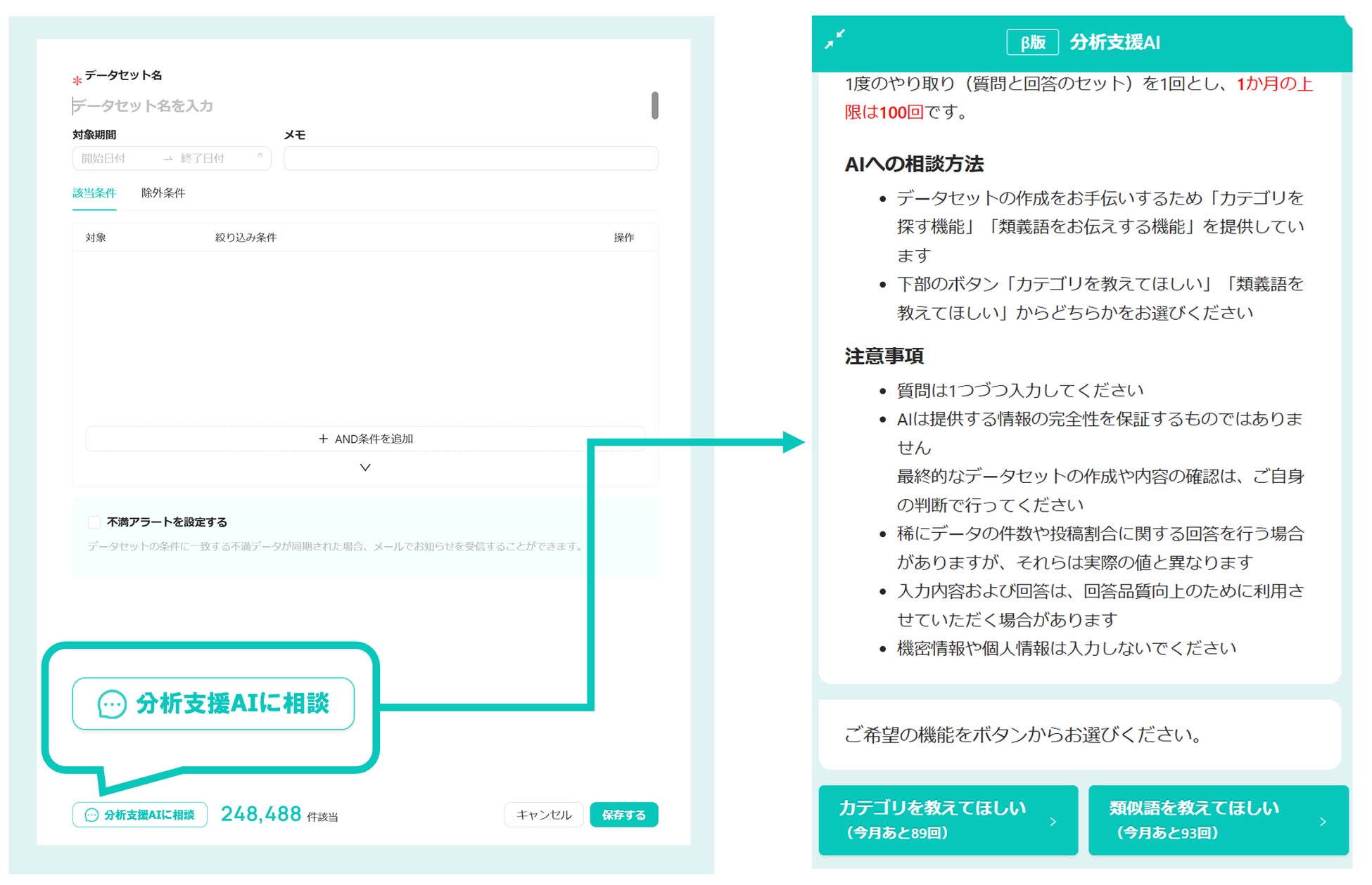 今回のバージョンアップで生成AIが分析をサポートする「分析支援AI」をリリースします。その第一弾となる今回は「分析支援AI」との対話を通じ「ユーザーの要望・分析目的に適うデータセットづくり」を効率化・高度化する新機能をリリースします。